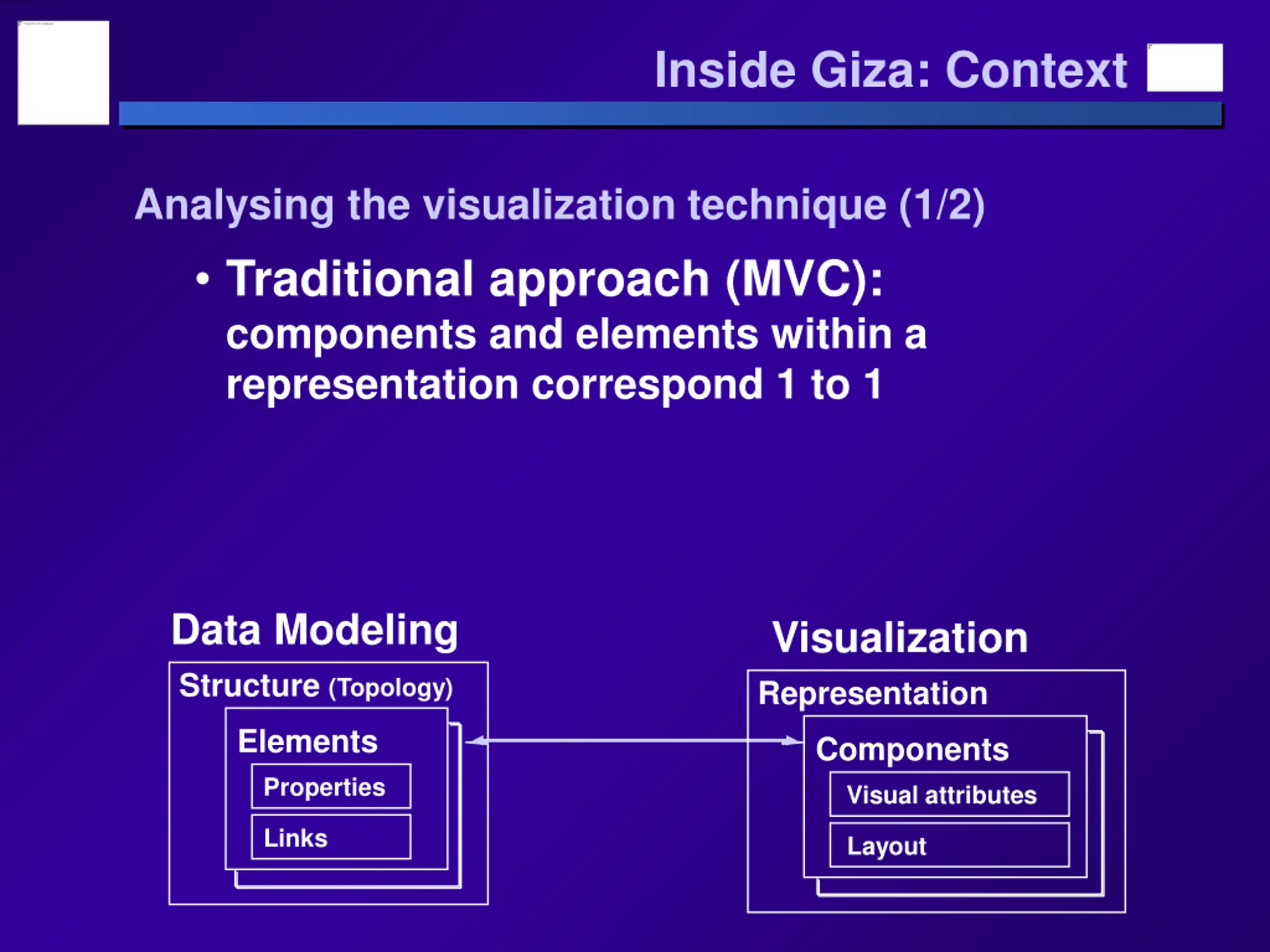 Inside Giza: Context Analysing the visualization technique (1/2) Traditional approach (MVC): components and elements within a representation correspond 1 to 1 Data Modeling Structure (Topology) Visualization Representation Elements Components Properties Visual attributes Links Layout