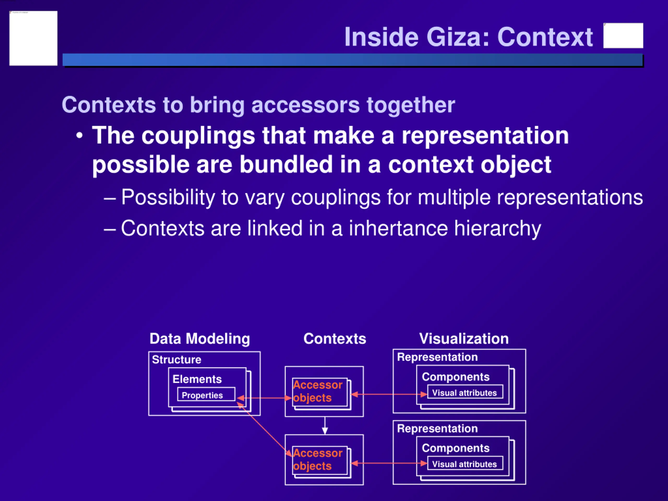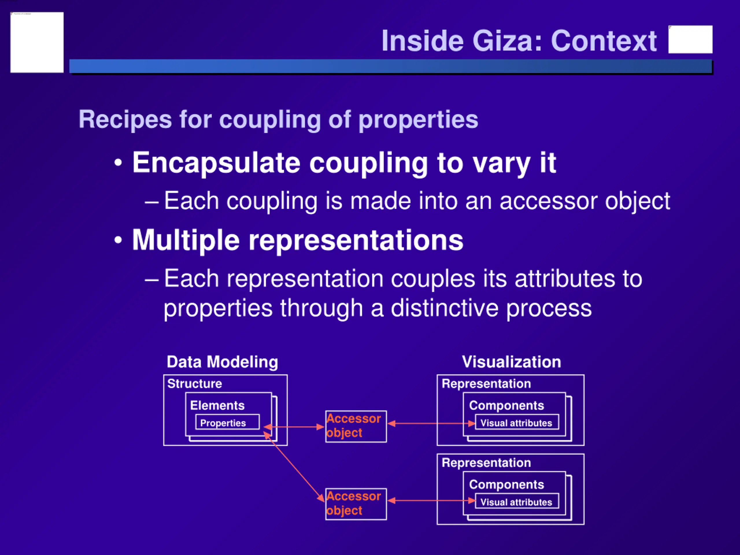 Inside Giza: Context Recipes for coupling of properties Encapsulate coupling to vary it Each coupling is made into an accessor object Multiple representations Each representation couples its attributes to properties through a distinctive process Data Modeling Structure Visualization Representation Elements Components Accessor object Properties Visual attributes Representation Components Accessor object Visual attributes