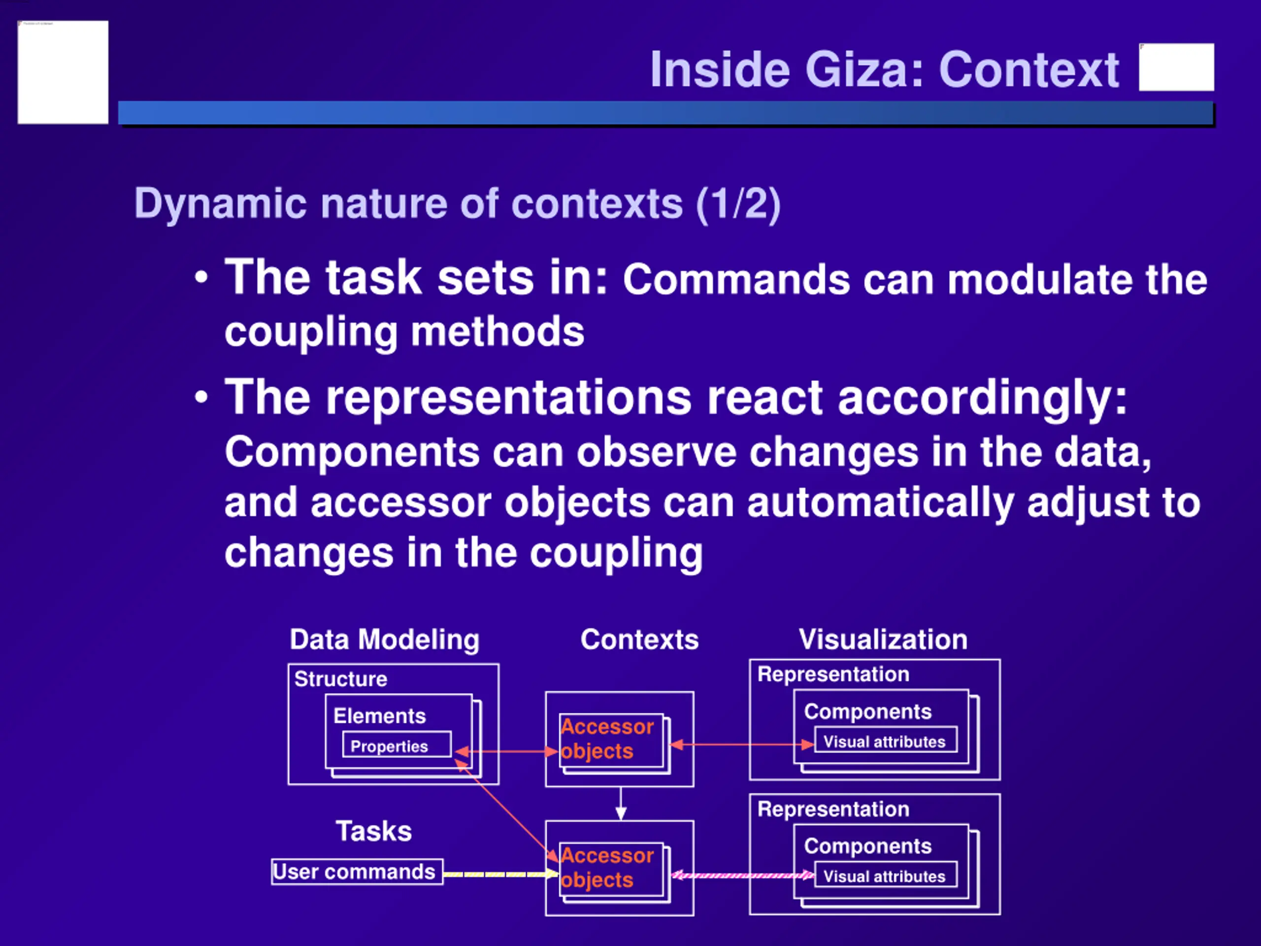 Inside Giza: Context Dynamic nature of contexts (1/2) The task sets in: Commands can modulate the coupling methods The representations react accordingly: Components can observe changes in the data, and accessor objects can automatically adjust to changes in the coupling Data Modeling Contexts Visualization Representation Structure Components Elements Accessor objects Visual attributes Properties Representation Tasks Components Accessor objects User commands Visual attributes
