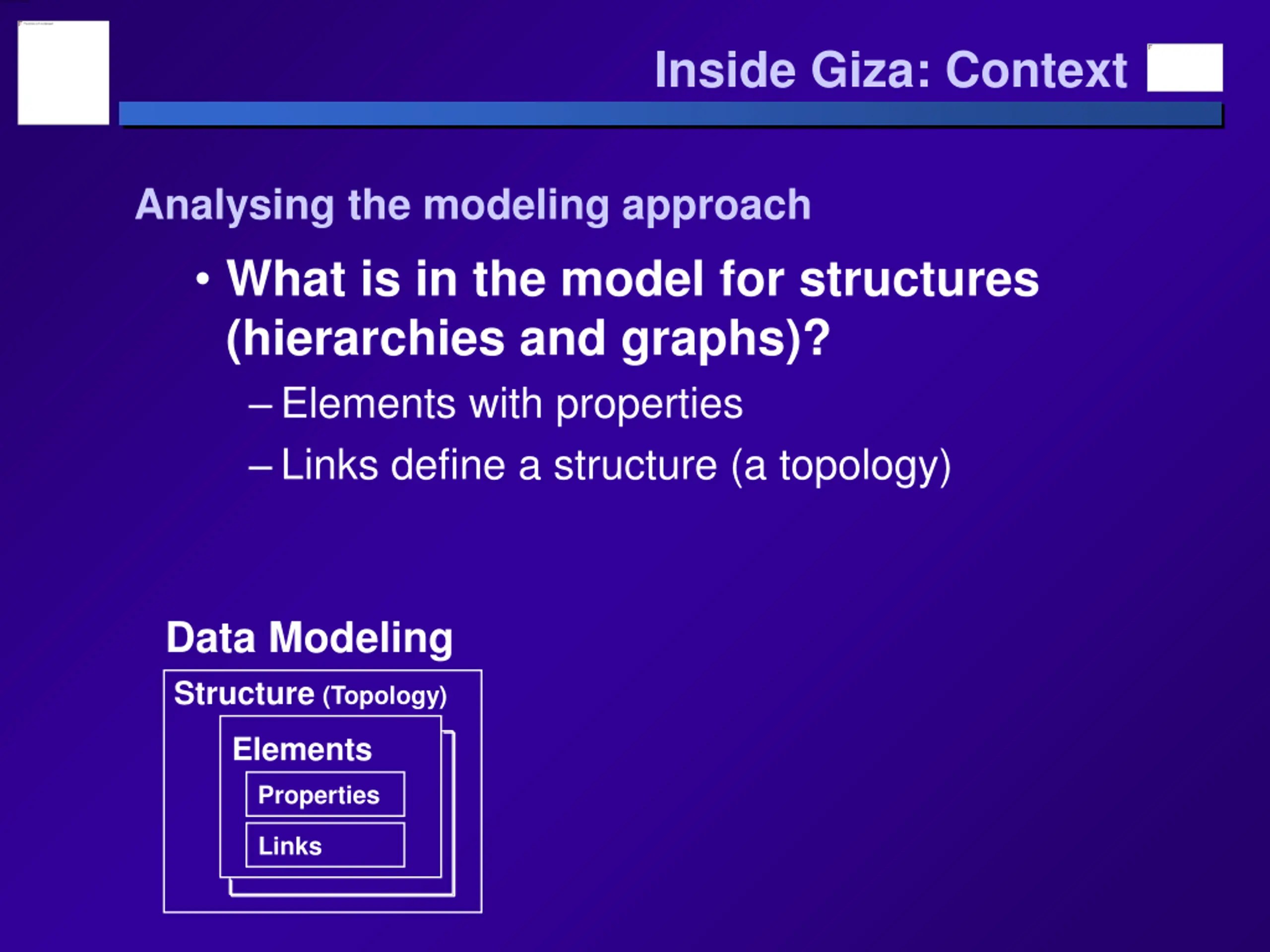 Inside Giza: Context Analysing the modeling approach What is in the model for structures (hierarchies and graphs)? Elements with properties Links define a structure (a topology) Data Modeling Structure (Topology) Elements Properties Links