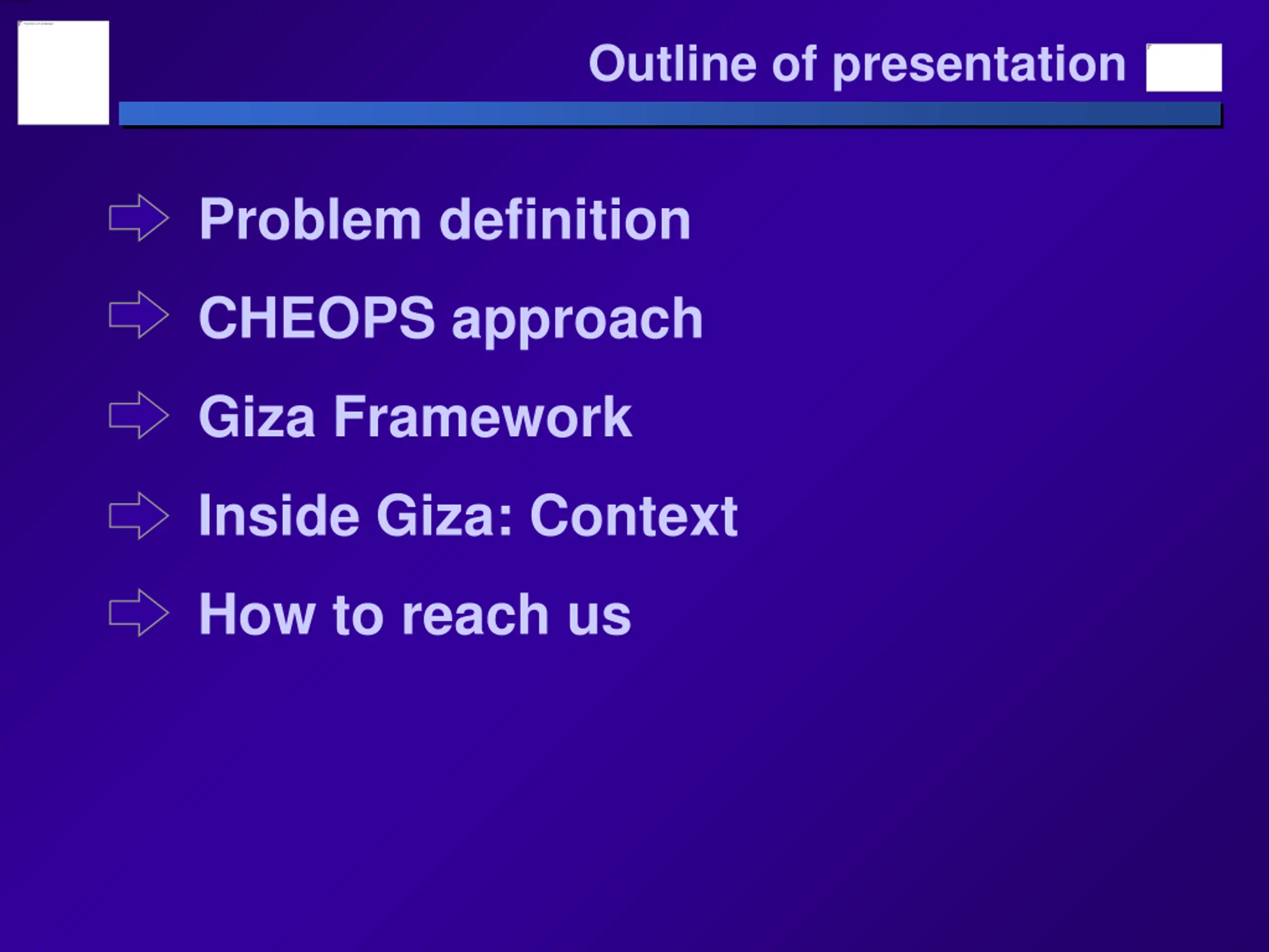 Outline of presentation Problem definition CHEOPS approach Giza Framework Inside Giza:Context How to reach us