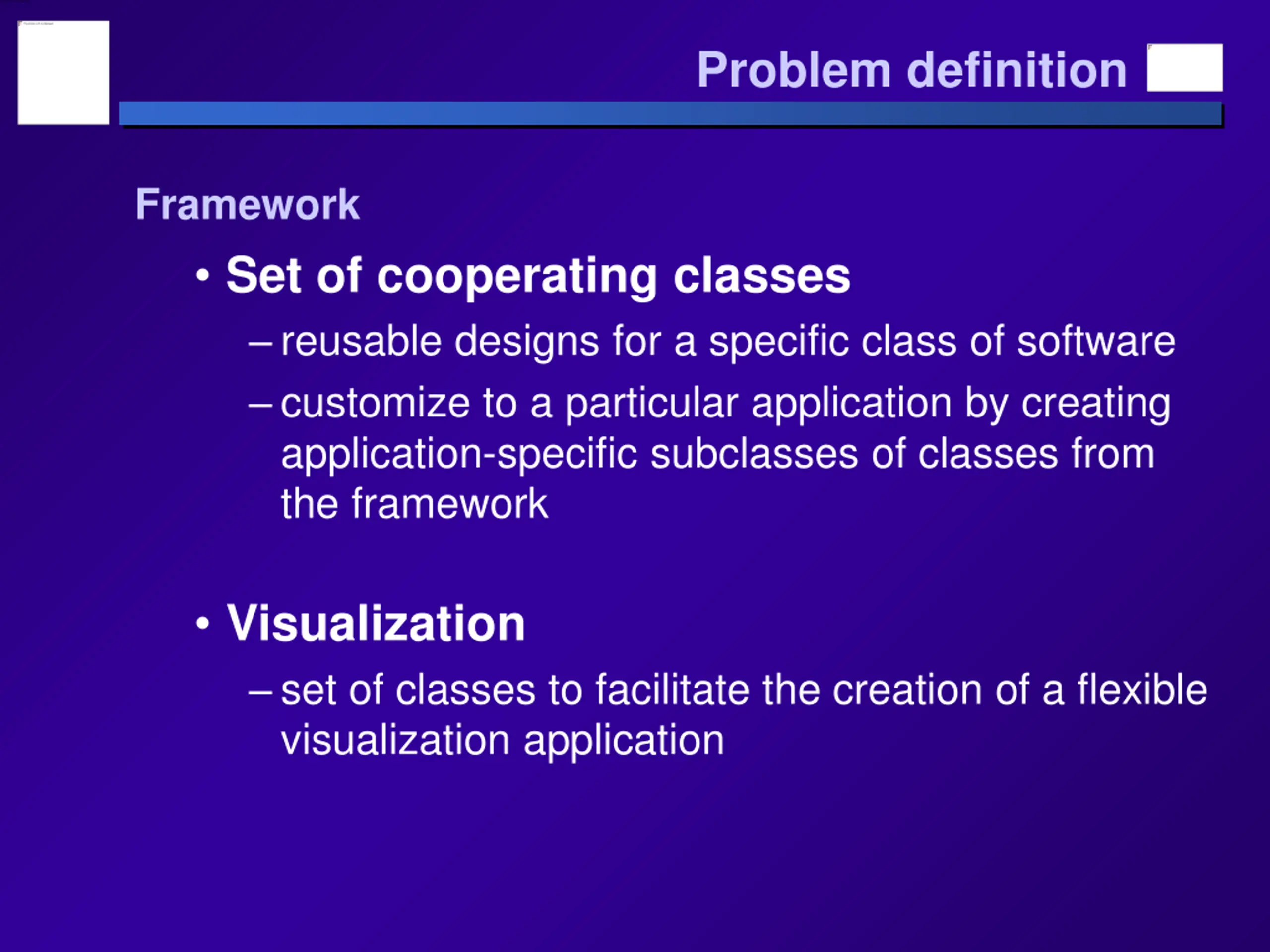 Problem definition Framework Set of cooperating classes reusable designs for a specific class of software customize to a particular application by creating application-specific subclasses of classes from the framework Visualization set of classes to facilitate the creation of a flexible visualization application