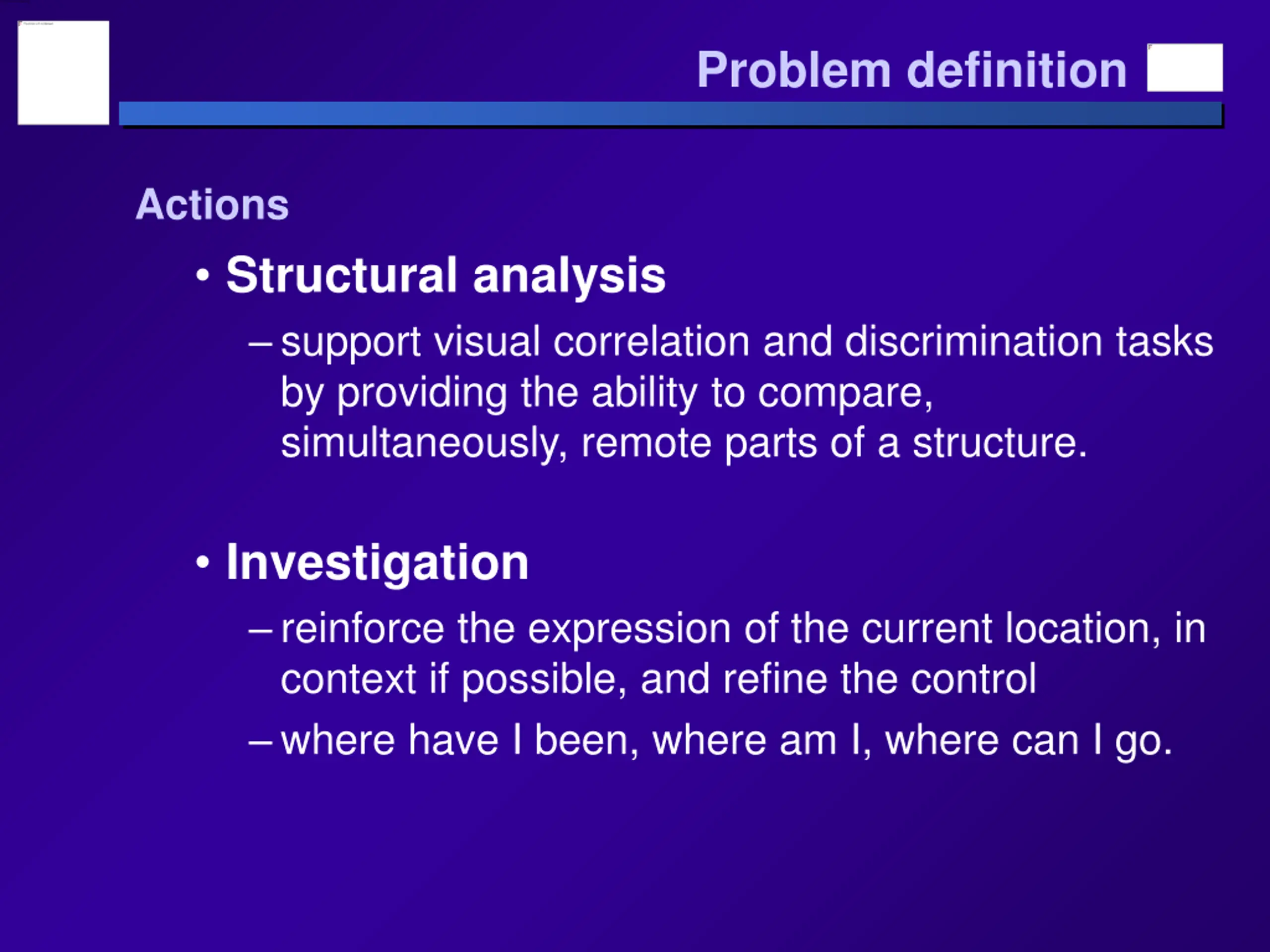 Problem definition Actions Structural analysis support visual correlation and discrimination tasks by providing the ability to compare, simultaneously, remote parts of a structure. Investigation reinforce the expression of the current location, in context if possible, and refine the control where have I been, where am I, where can I go.