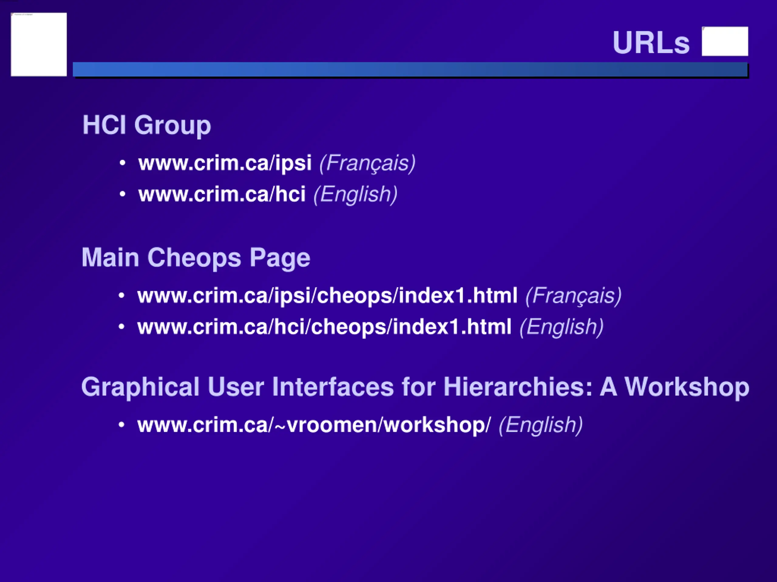 URLs HCI Group www.crim.ca/ipsi (Fran ais) www.crim.ca/hci(English) Main Cheops Page www.crim.ca/ipsi/cheops/index1.html (Fran ais) www.crim.ca/hci/cheops/index1.html(English) Graphical User Interfaces for Hierarchies: A Workshop www.crim.ca/~vroomen/workshop/ (English)