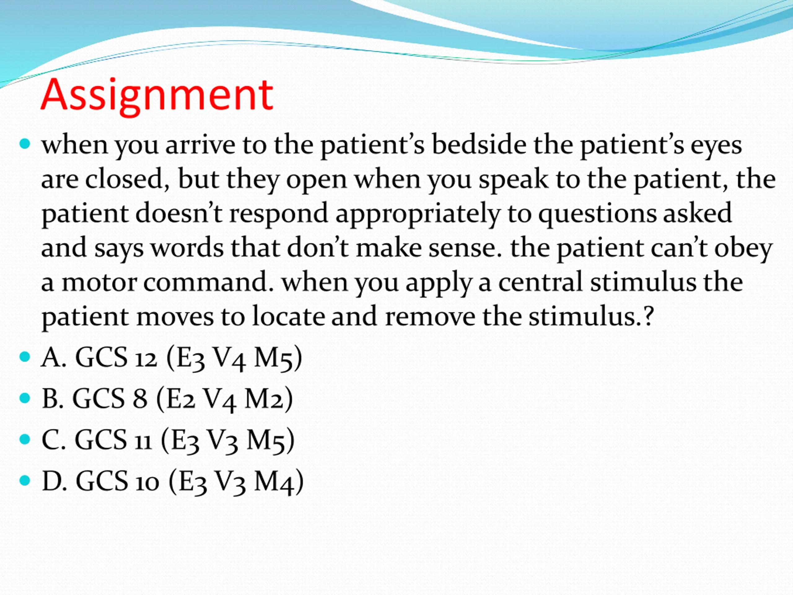 Assignment when you arrive to the patient s bedside the patient s eyes are closed, but they open when you speak to the patient, the patient doesn t respond appropriately to questions asked and says words that don t make sense. the patient can t obey a motor command. when you apply a central stimulus the patient moves to locate and remove the stimulus.? A. GCS 12 (E3 V4 M5) B. GCS 8 (E2 V4 M2) C. GCS 11 (E3 V3 M5) D. GCS 10 (E3 V3 M4)