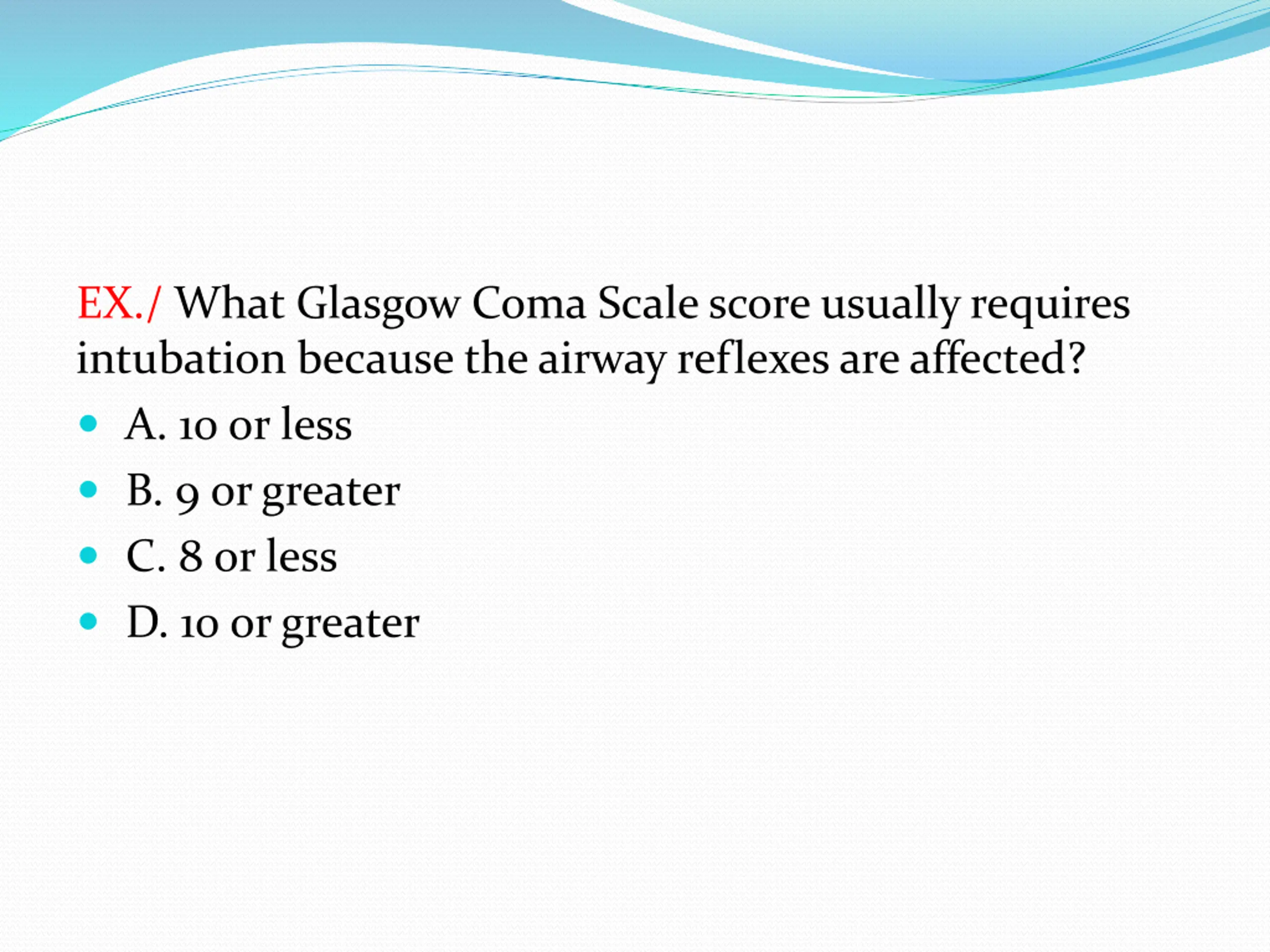 EX./ What Glasgow Coma Scale score usually requires intubation because the airway reflexes are affected? A. 10 or less B. 9 or greater C. 8 or less D. 10 or greater