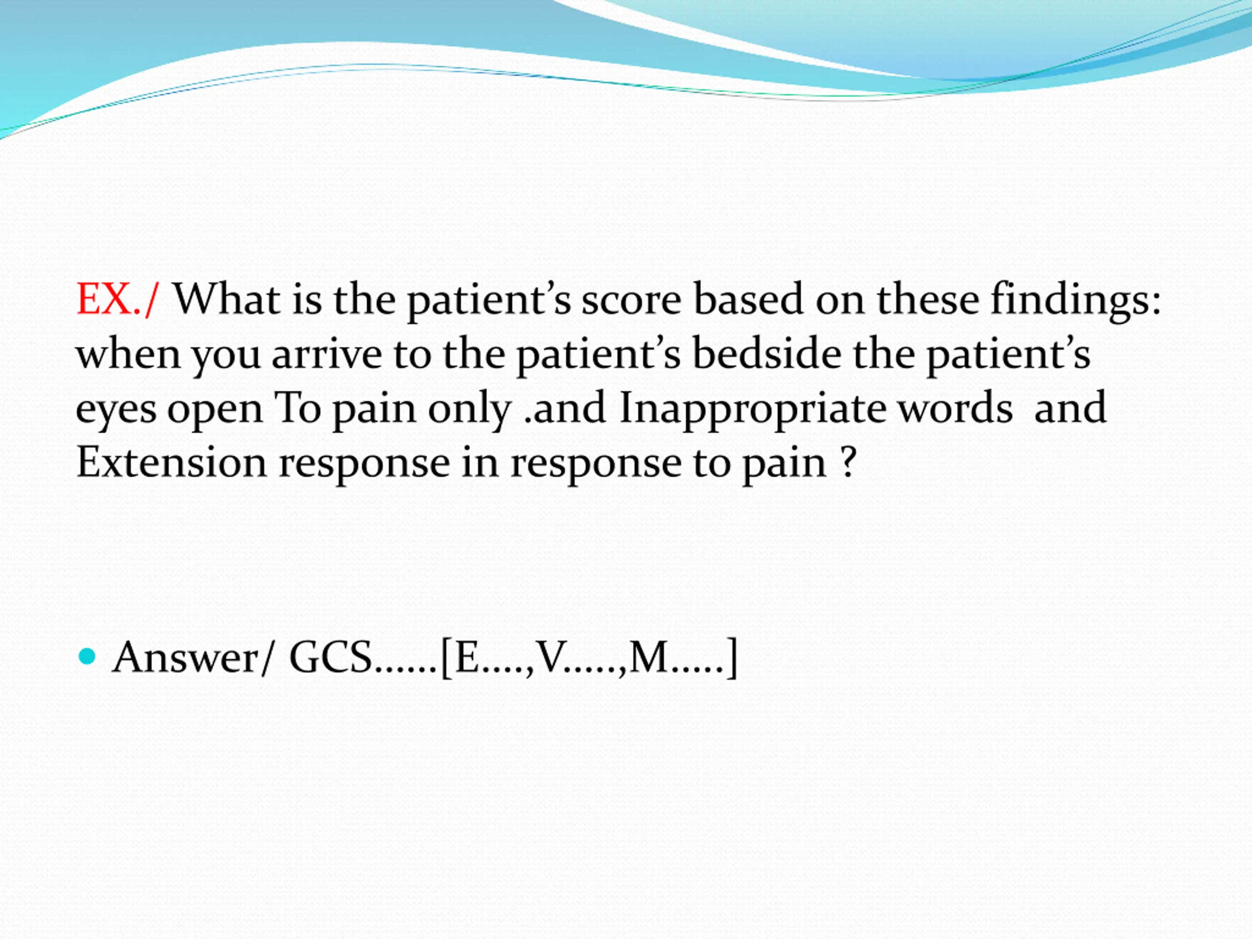 EX./ What is the patients score based on these findings: when you arrive to the patient s bedside the patient s eyes open To pain only .and Inappropriate words and Extension response in response to pain ? Answer/ GCS [E .,V ..,M ..]