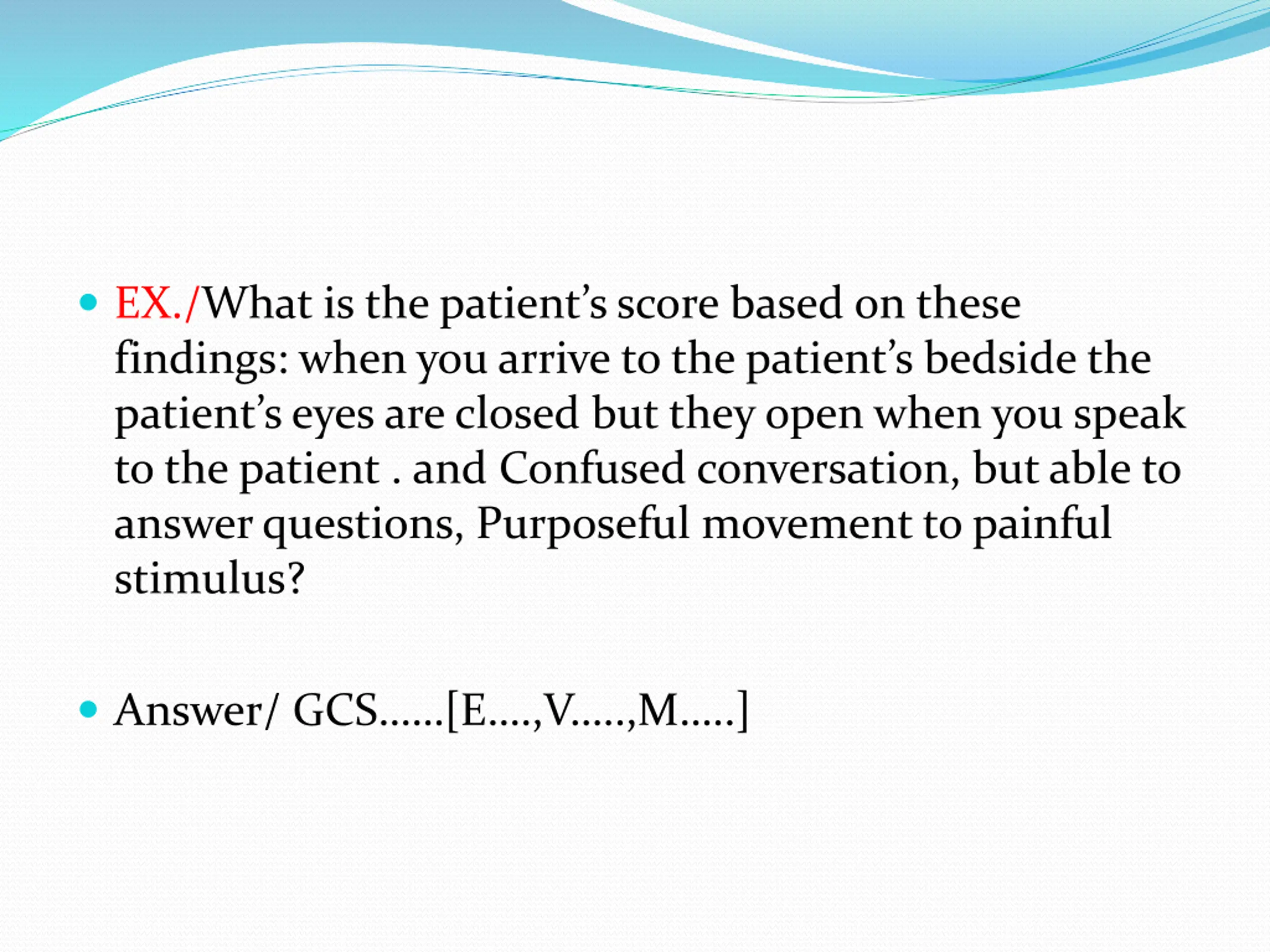 EX./What is the patients score based on these findings: when you arrive to the patient s bedside the patient s eyes are closed but they open when you speak to the patient . and Confused conversation, but able to answer questions, Purposeful movement to painful stimulus? Answer/ GCS [E .,V ..,M ..]
