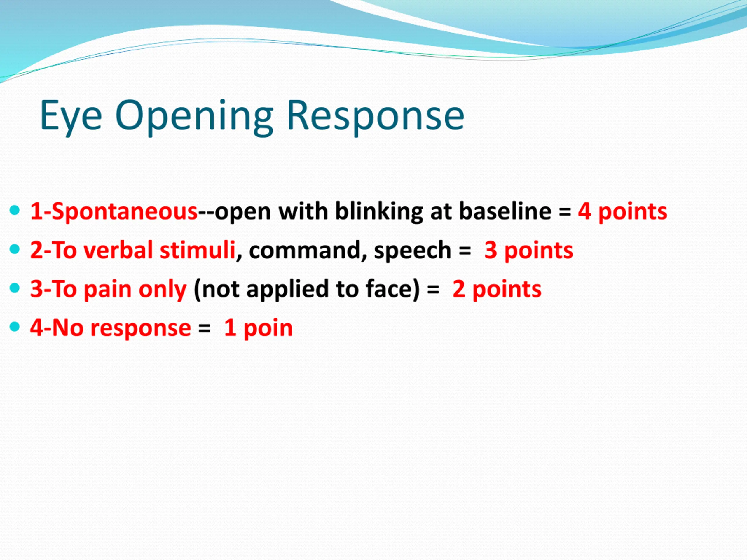 Eye Opening Response 1-Spontaneous--open with blinking at baseline = 4 points 2-To verbal stimuli, command, speech = 3 points 3-To pain only (not applied to face) = 2 points 4-No response = 1 poin