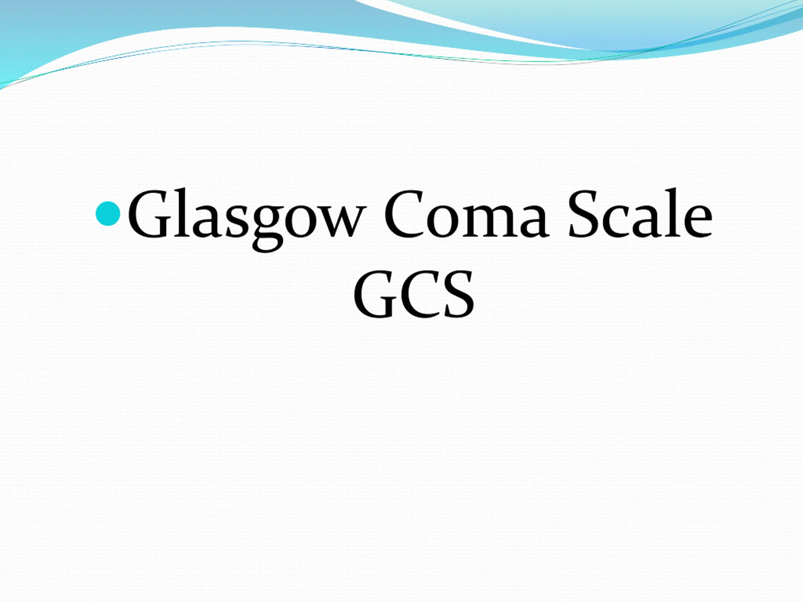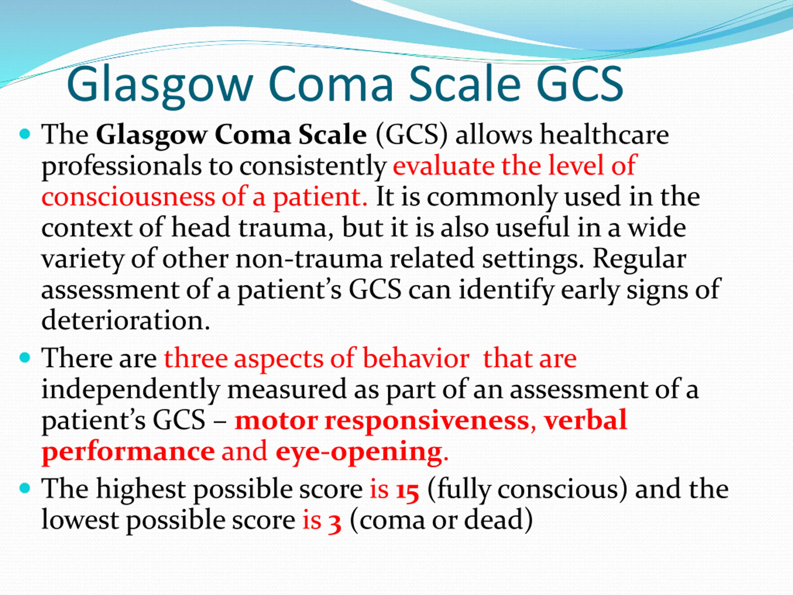 Glasgow Coma Scale GCS The Glasgow Coma Scale (GCS) allows healthcare professionals to consistently evaluate the level of consciousness of a patient. It is commonly used in the context of head trauma, but it is also useful in a wide variety of other non-trauma related settings. Regular assessment of a patient s GCS can identify early signs of deterioration. There are three aspects of behavior that are independently measured as part of an assessment of a patient s GCS motor responsiveness, verbal performance and eye-opening. The highest possible score is 15 (fully conscious) and the lowest possible score is 3 (coma or dead)