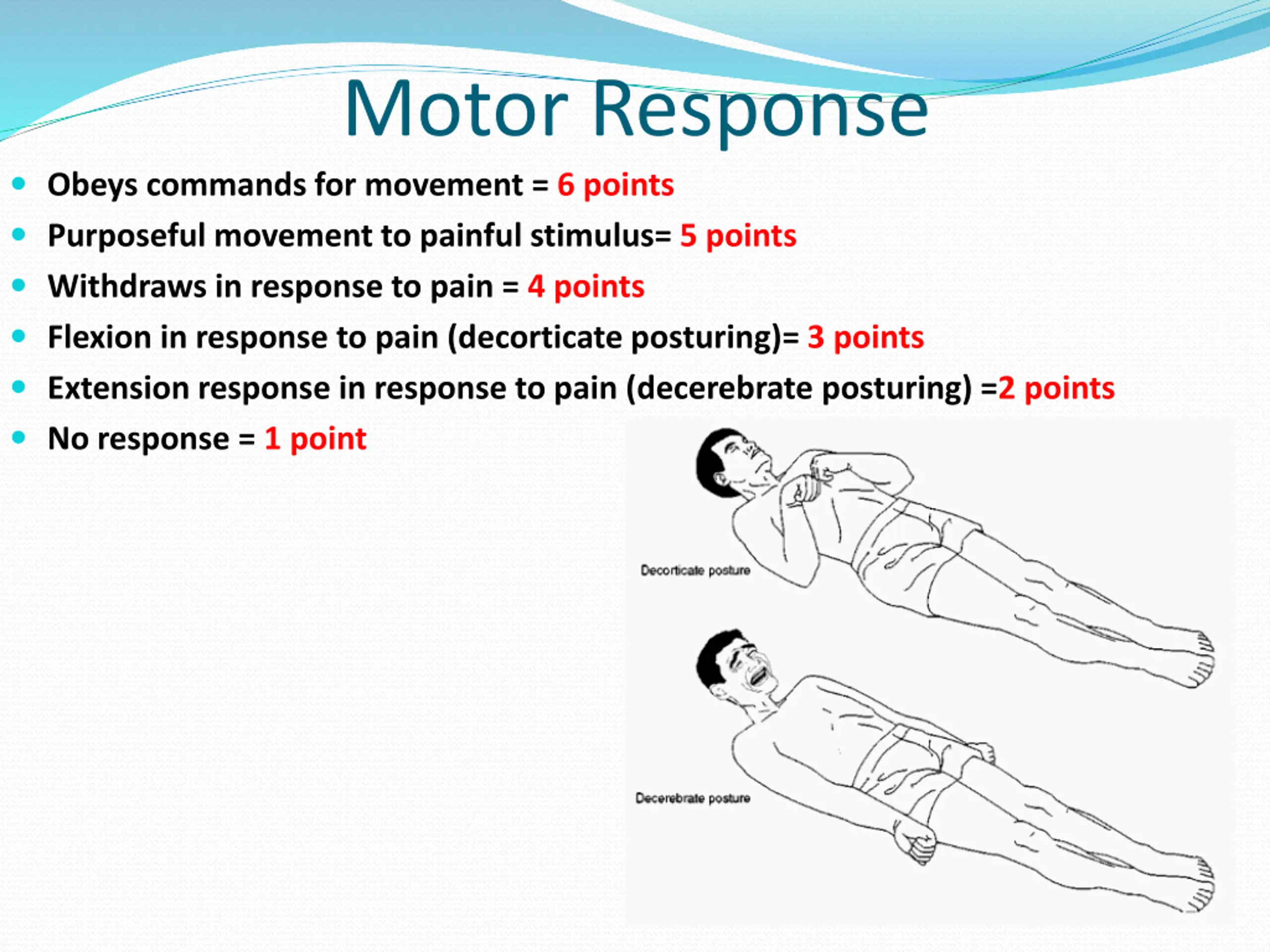 Motor Response Obeys commands for movement = 6 points Purposeful movement to painful stimulus= 5 points Withdraws in response to pain = 4 points Flexion in response to pain (decorticate posturing)= 3 points Extension response in response to pain (decerebrate posturing) =2 points No response = 1 point