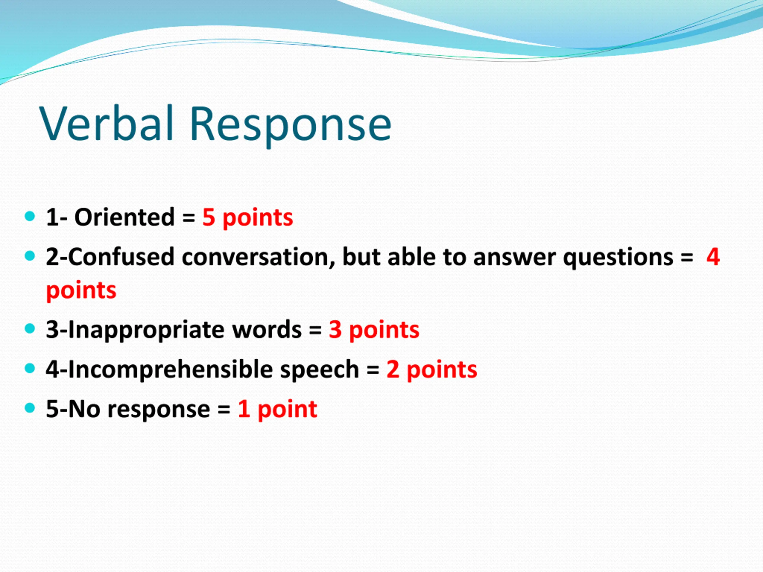 Verbal Response 1- Oriented = 5 points 2-Confused conversation, but able to answer questions = 4 points 3-Inappropriate words = 3 points 4-Incomprehensible speech = 2 points 5-No response = 1 point