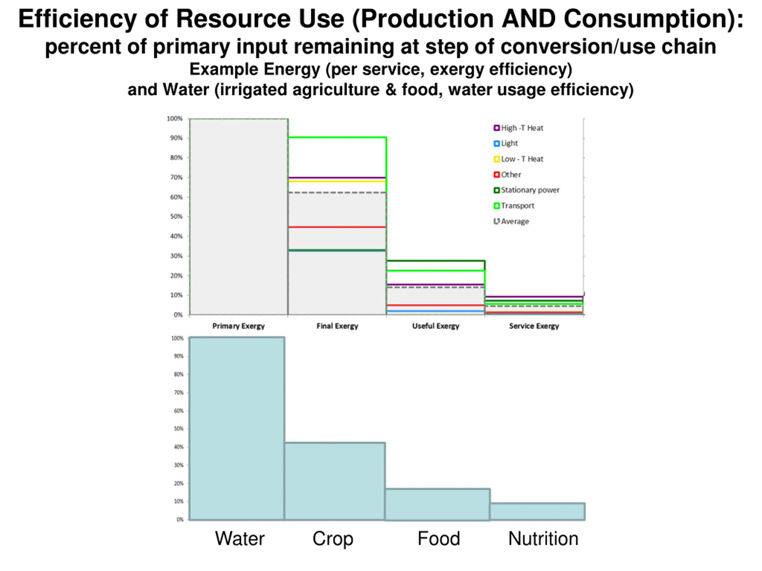 Efficiency of Resource Use (Production AND Consumption): percent of primary input remaining at step of conversion/use chain Example Energy (per service, exergy efficiency) and Water (irrigated agriculture & food, water usage efficiency) Water Crop Food Nutrition
