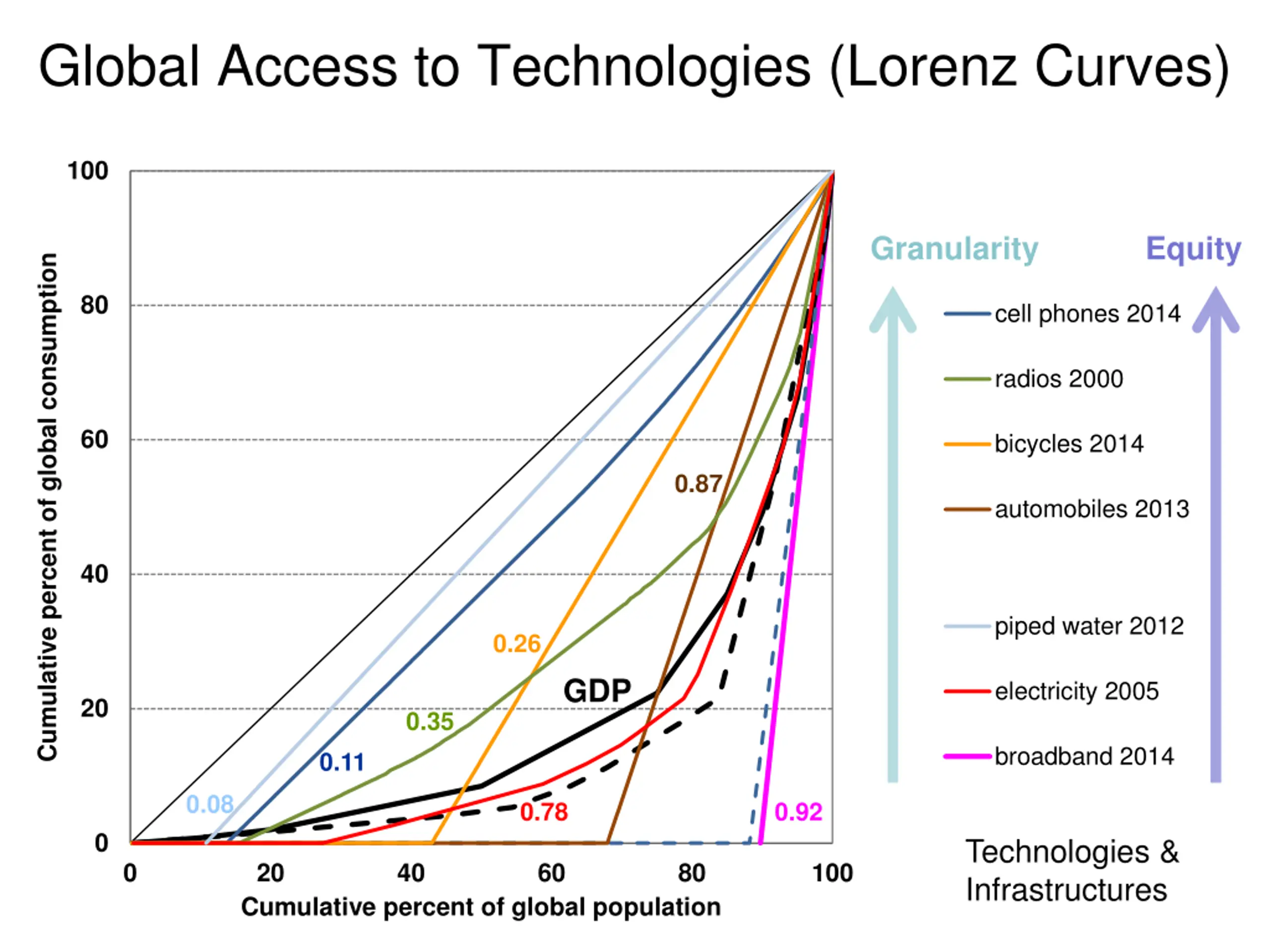 100 100 Global Access to Technologies (Lorenz Curves) equity line equity line GDP MER 80 GDP MER 100 GDP PPP Cumulative percent of global consumption 80 GDP PPP Granularity Equity Cumulative percent of global consumption cell phones 2000 Cumulative percent of global consumption cell phones 2000 80 cell phones 2014 60 cell phones 2014 radios 2000 60 radios 2000 60 bicycles 2014 0.87 bicycles 2014 automobiles 2013 40 automobiles 2013 40 40 piped water 2012 piped water 2012 electricity 2005 0.26 GDP electricity 2005 20 broadband 2014 20 0.35 20 broadband 2014 0.11 0.08 0.78 0.92 0 Technologies & Infrastructures 0 20 40 60 0 80 100 0 Cumulative percent of global population 20 40 60 80 100 0 Cumulative percent of global population 0 20 40 60 80 100 Cumulative percent of global population