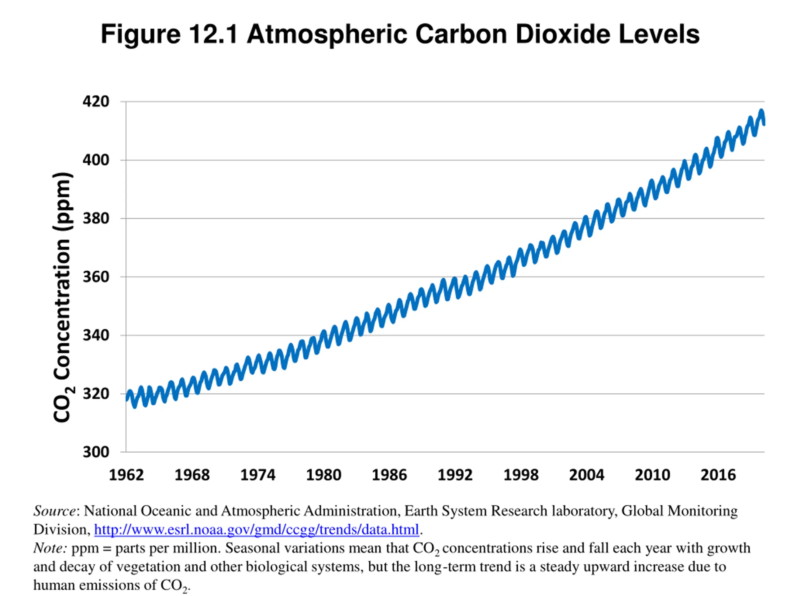 Figure 12.1 Atmospheric Carbon Dioxide Levels 420 400 CO2 Concentration (ppm) 380 360 340 320 300 1962 1968 1974 1980 1986 1992 1998 2004 2010 2016 Source: National Oceanic and Atmospheric Administration, Earth System Research laboratory, Global Monitoring Division, http://www.esrl.noaa.gov/gmd/ccgg/trends/data.html. Note: ppm = parts per million. Seasonal variations mean that CO2 concentrations rise and fall each year with growth and decay of vegetation and other biological systems, but the long-term trend is a steady upward increase due to human emissions of CO2.