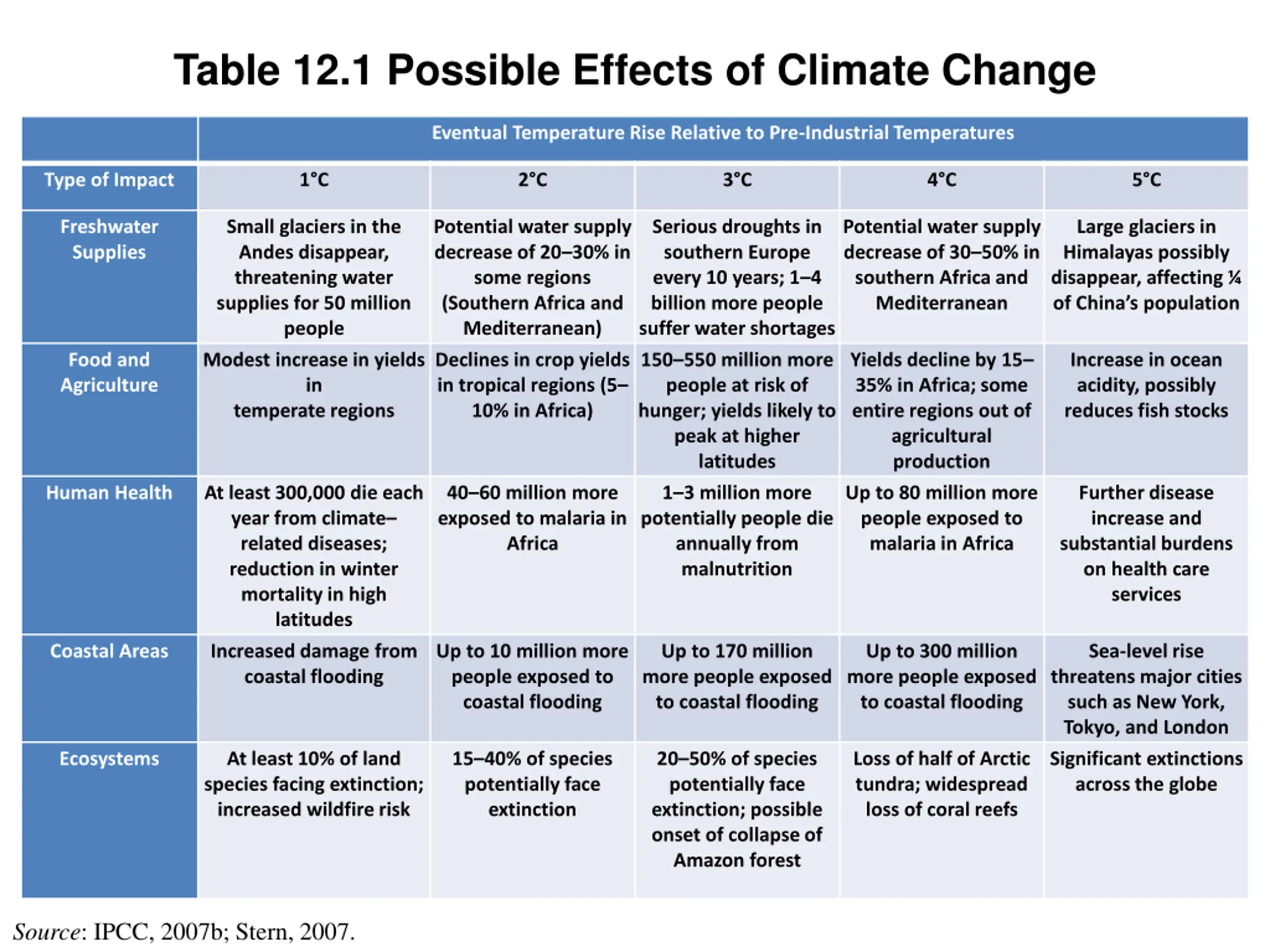 Table 12.1 Possible Effects of Climate Change Eventual Temperature Rise Relative to Pre-Industrial Temperatures Type of Impact 1 C 2 C 3 C 4 C 5 C Freshwater Supplies Small glaciers in the Andes disappear, threatening water supplies for 50 million people Modest increase in yields in temperate regions Potential water supply decrease of 20 30% in some regions (Southern Africa and Mediterranean) Declines in crop yields in tropical regions (5 10% in Africa) Serious droughts in southern Europe every 10 years; 1 4 billion more people suffer water shortages 150 550 million more people at risk of hunger; yields likely to peak at higher latitudes 1 3 million more potentially people die annually from malnutrition Potential water supply decrease of 30 50% in southern Africa and Mediterranean Large glaciers in Himalayas possibly disappear, affecting of China s population Food and Agriculture Yields decline by 15 35% in Africa; some entire regions out of agricultural production Up to 80 million more people exposed to malaria in Africa Increase in ocean acidity, possibly reduces fish stocks Human Health At least 300,000 die each year from climate related diseases; reduction in winter mortality in high latitudes Increased damage from coastal flooding 40 60 million more exposed to malaria in Africa Further disease increase and substantial burdens on health care services Coastal Areas Up to 10 million more people exposed to coastal flooding Up to 170 million more people exposed to coastal flooding Up to 300 million more people exposed to coastal flooding Sea-level rise threatens major cities such as New York, Tokyo, and London Significant extinctions across the globe Ecosystems At least 10% of land species facing extinction; increased wildfire risk 15 40% of species potentially face extinction 20 50% of species potentially face extinction; possible onset of collapse of Amazon forest Loss of half of Arctic tundra; widespread loss of coral reefs Source: IPCC, 2007b; Stern, 2007.