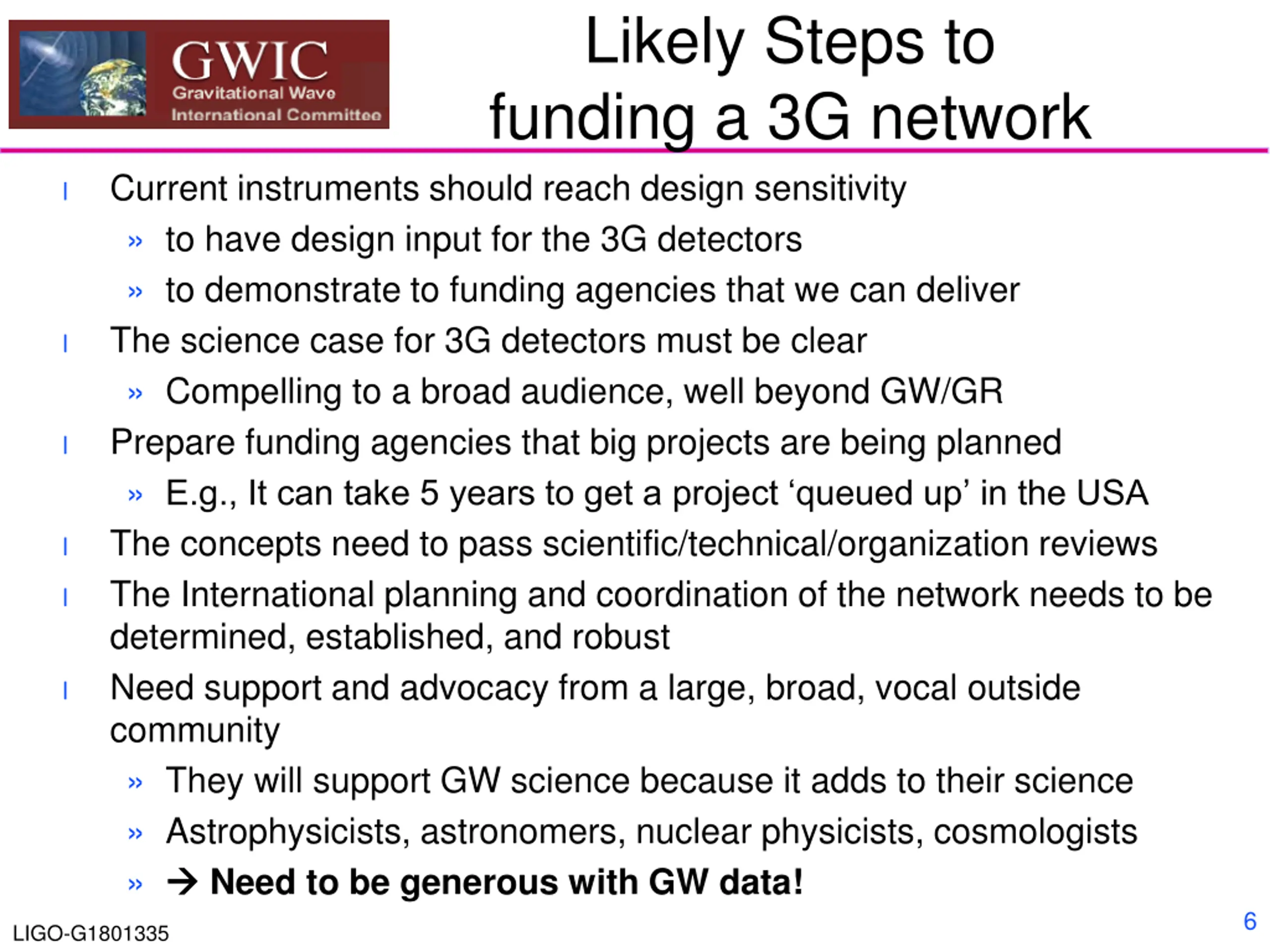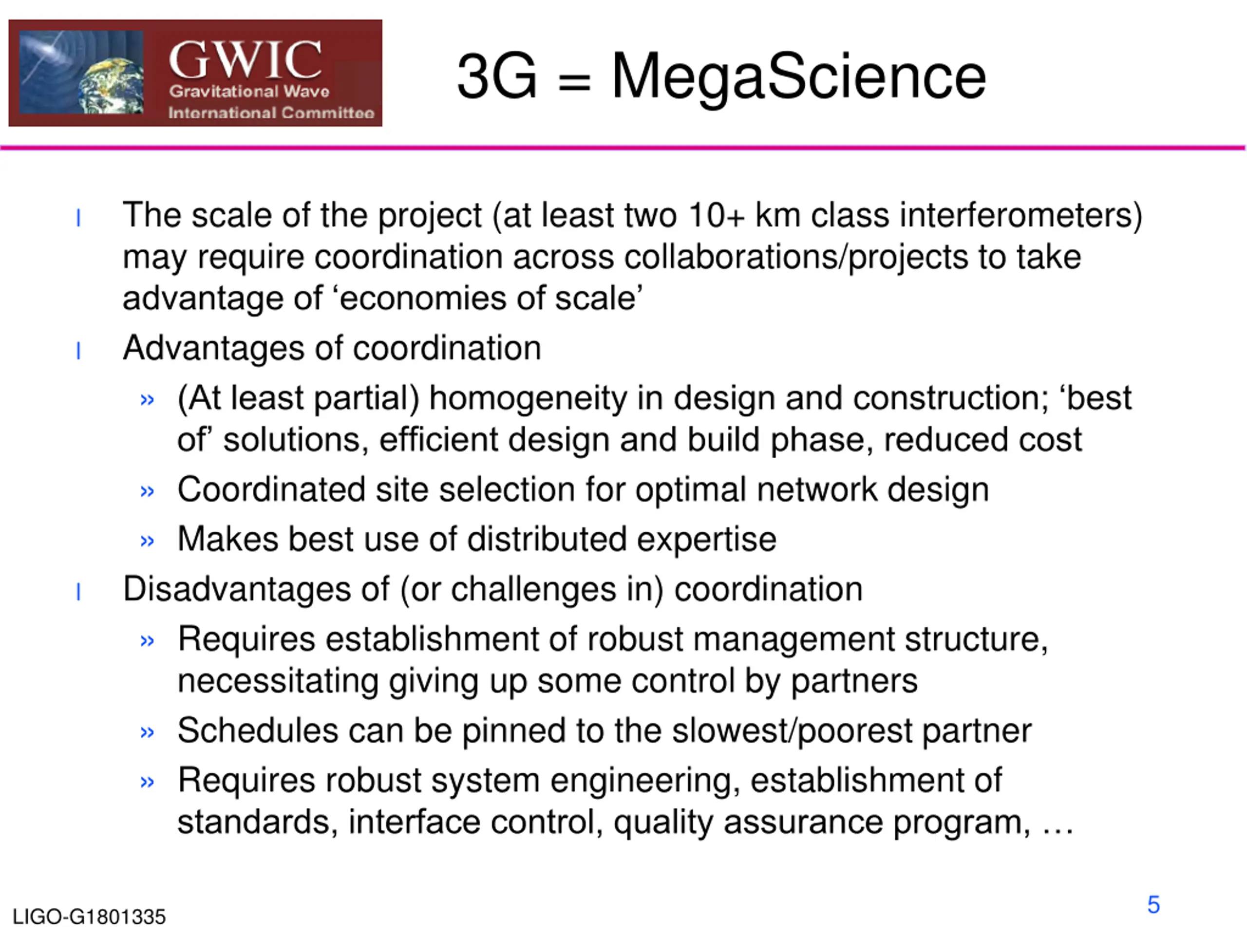 3G = MegaScience The scale of the project (at least two 10+ km class interferometers) may require coordination across collaborations/projects to take advantage of economies of scale Advantages of coordination (At least partial) homogeneity in design and construction; best of solutions, efficient design and build phase, reduced cost Coordinated site selection for optimal network design Makes best use of distributed expertise Disadvantages of (or challenges in) coordination Requires establishment of robust management structure, necessitating giving up some control by partners Schedules can be pinned to the slowest/poorest partner Requires robust system engineering, establishment of standards, interface control, quality assurance program, l l l 5 LIGO-G1801335
