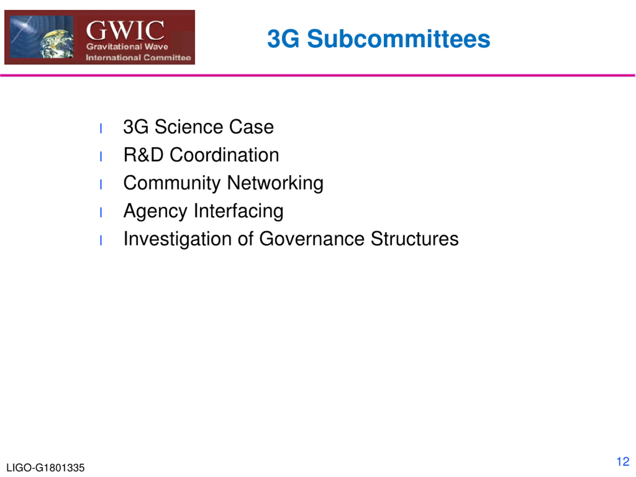 3G Subcommittees 3G Science Case R&D Coordination Community Networking Agency Interfacing Investigation of Governance Structures l l l l l 12 LIGO-G1801335