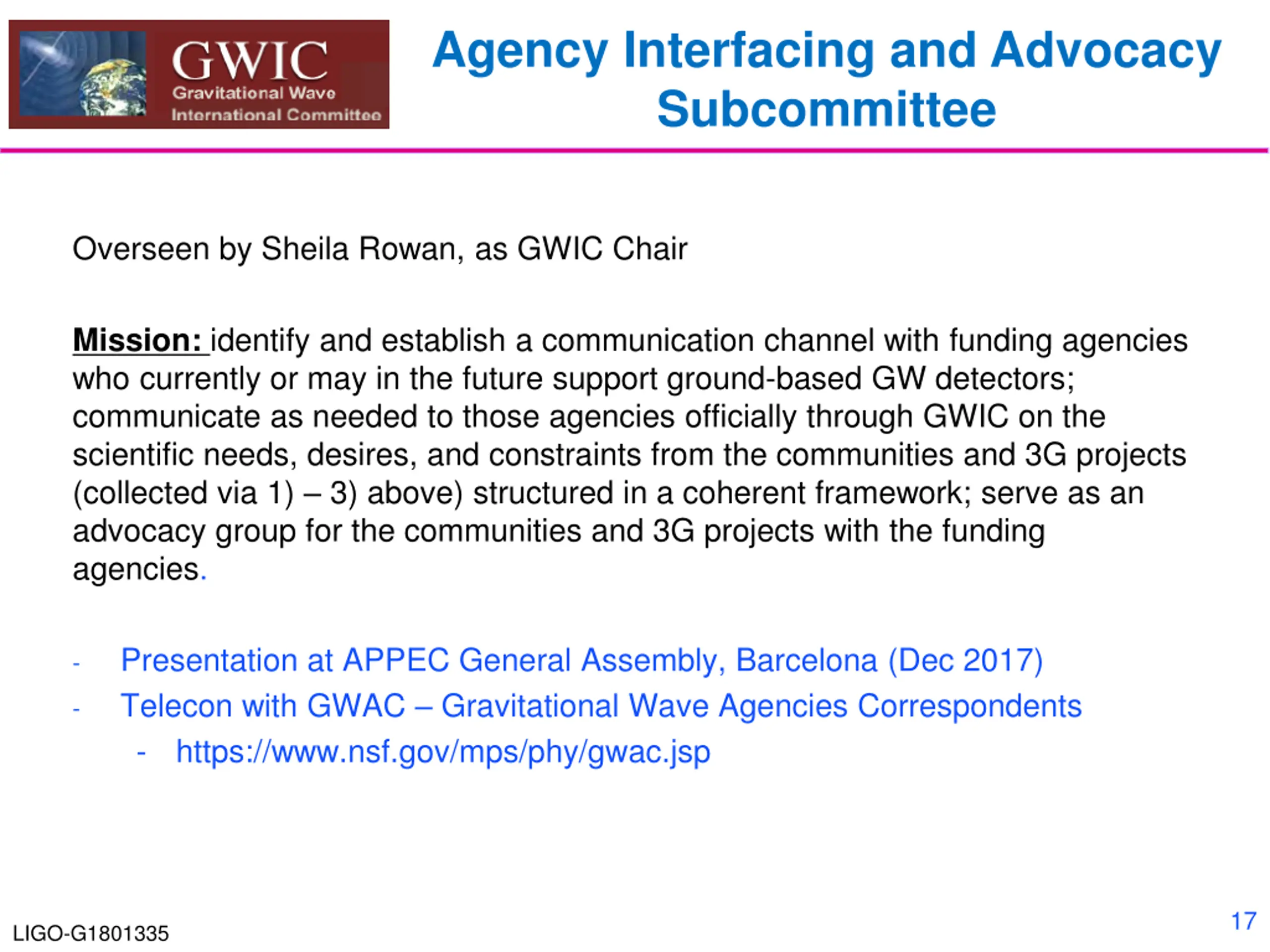 Agency Interfacing and Advocacy Subcommittee Overseen by Sheila Rowan, as GWIC Chair Mission: identify and establish a communication channel with funding agencies who currently or may in the future support ground-based GW detectors; communicate as needed to those agencies officially through GWIC on the scientific needs, desires, and constraints from the communities and 3G projects (collected via 1) 3) above) structured in a coherent framework; serve as an advocacy group for the communities and 3G projects with the funding agencies. Presentation at APPEC General Assembly, Barcelona (Dec 2017) Telecon with GWAC Gravitational Wave Agencies Correspondents - https://www.nsf.gov/mps/phy/gwac.jsp - - 17 LIGO-G1801335