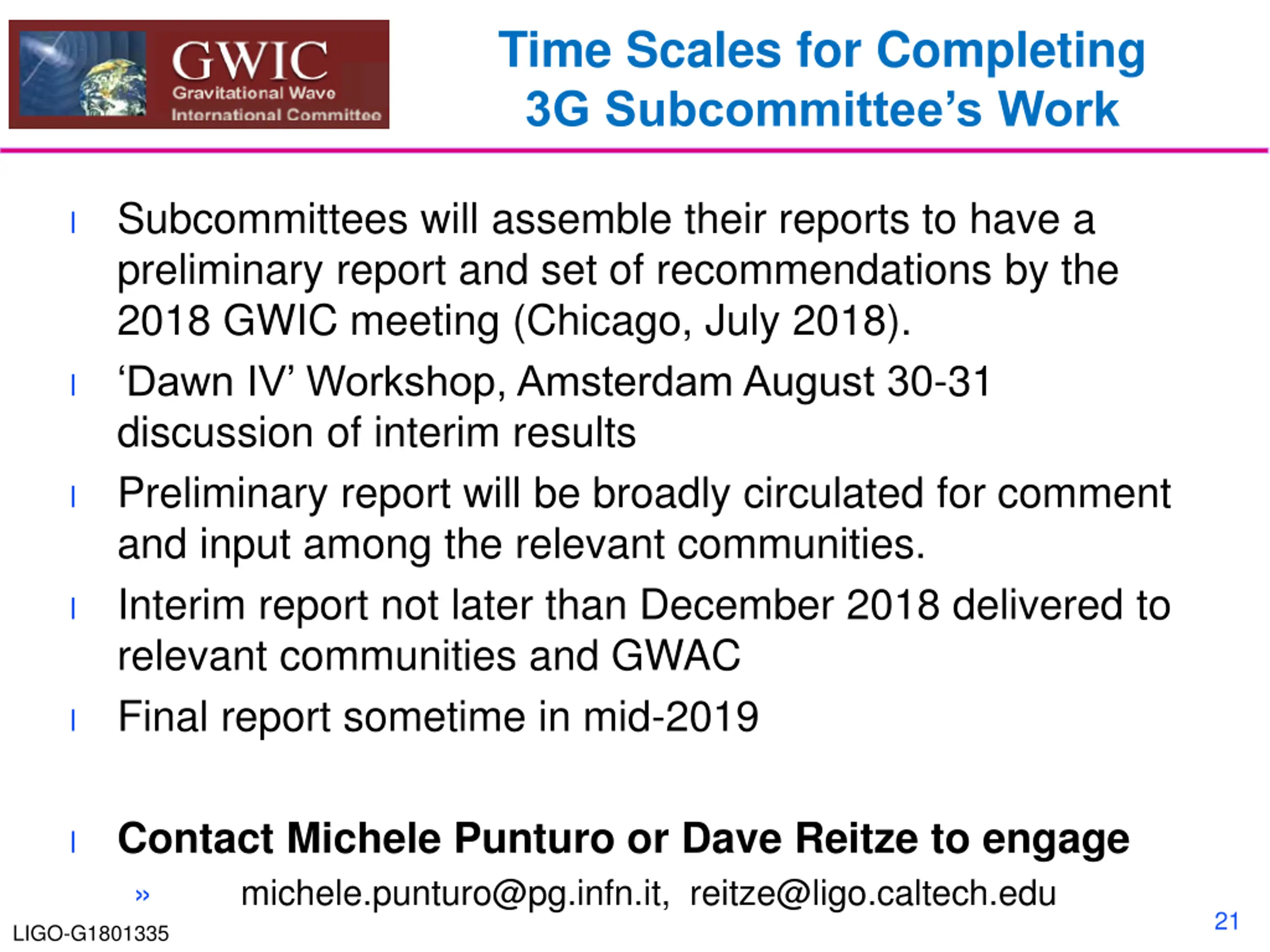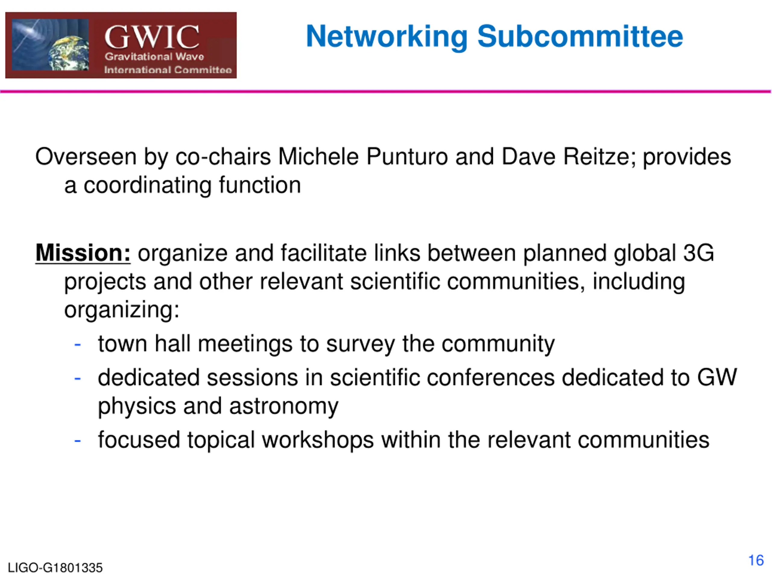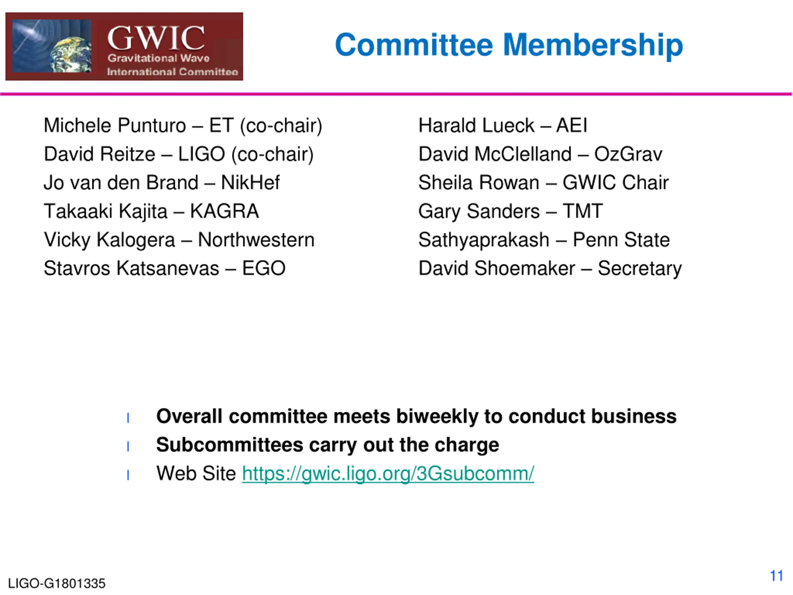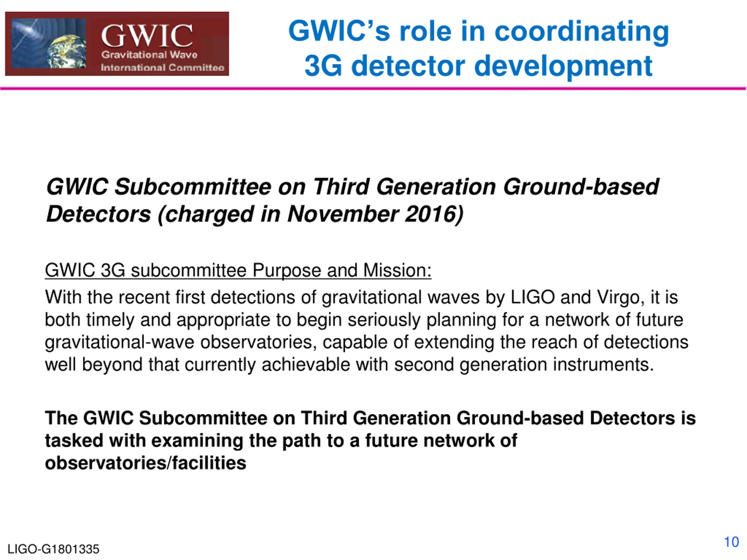 GWICs role in coordinating 3G detector development GWIC Subcommittee on Third Generation Ground-based Detectors (charged in November 2016) GWIC 3G subcommittee Purpose and Mission: With the recent first detections of gravitational waves by LIGO and Virgo, it is both timely and appropriate to begin seriously planning for a network of future gravitational-wave observatories, capable of extending the reach of detections well beyond that currently achievable with second generation instruments. The GWIC Subcommittee on Third Generation Ground-based Detectors is tasked with examining the path to a future network of observatories/facilities 10 LIGO-G1801335