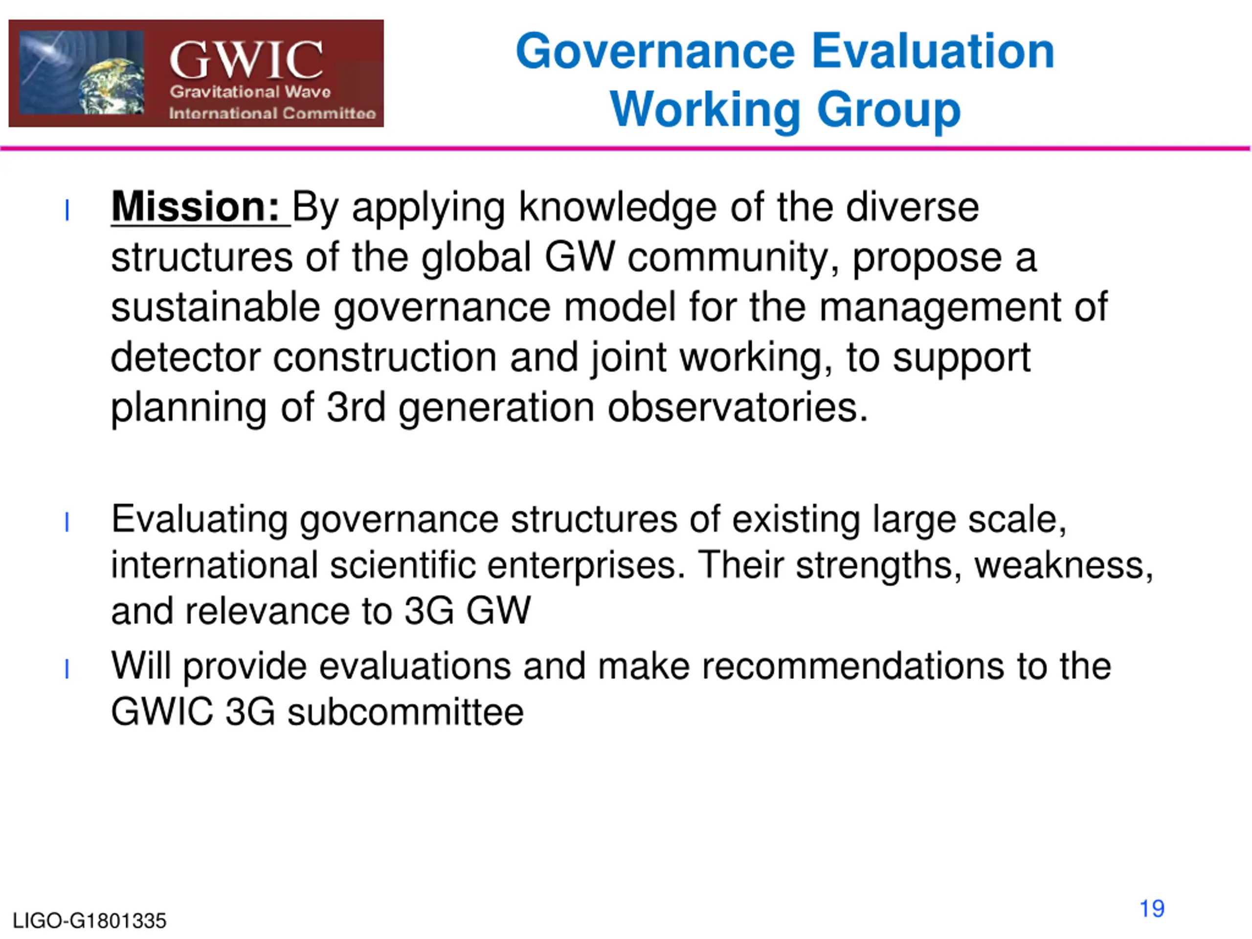 Governance Evaluation Working Group Mission: By applying knowledge of the diverse structures of the global GW community, propose a sustainable governance model for the management of detector construction and joint working, to support planning of 3rd generation observatories. l Evaluating governance structures of existing large scale, international scientific enterprises. Their strengths, weakness, and relevance to 3G GW Will provide evaluations and make recommendations to the GWIC 3G subcommittee l l 19 LIGO-G1801335