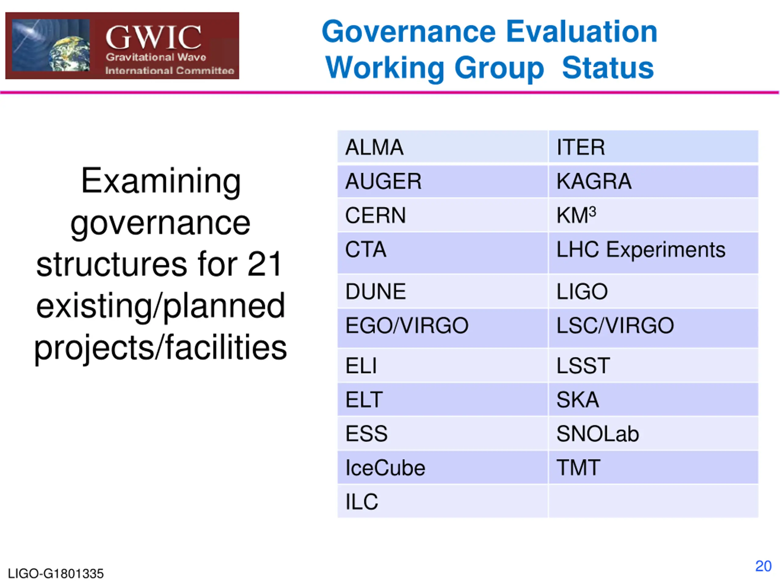 Governance Evaluation Working Group Status ALMA AUGER CERN CTA ITER KAGRA KM3 LHC Experiments Examining governance structures for 21 existing/planned projects/facilities DUNE EGO/VIRGO LIGO LSC/VIRGO ELI ELT ESS IceCube ILC LSST SKA SNOLab TMT 20 LIGO-G1801335