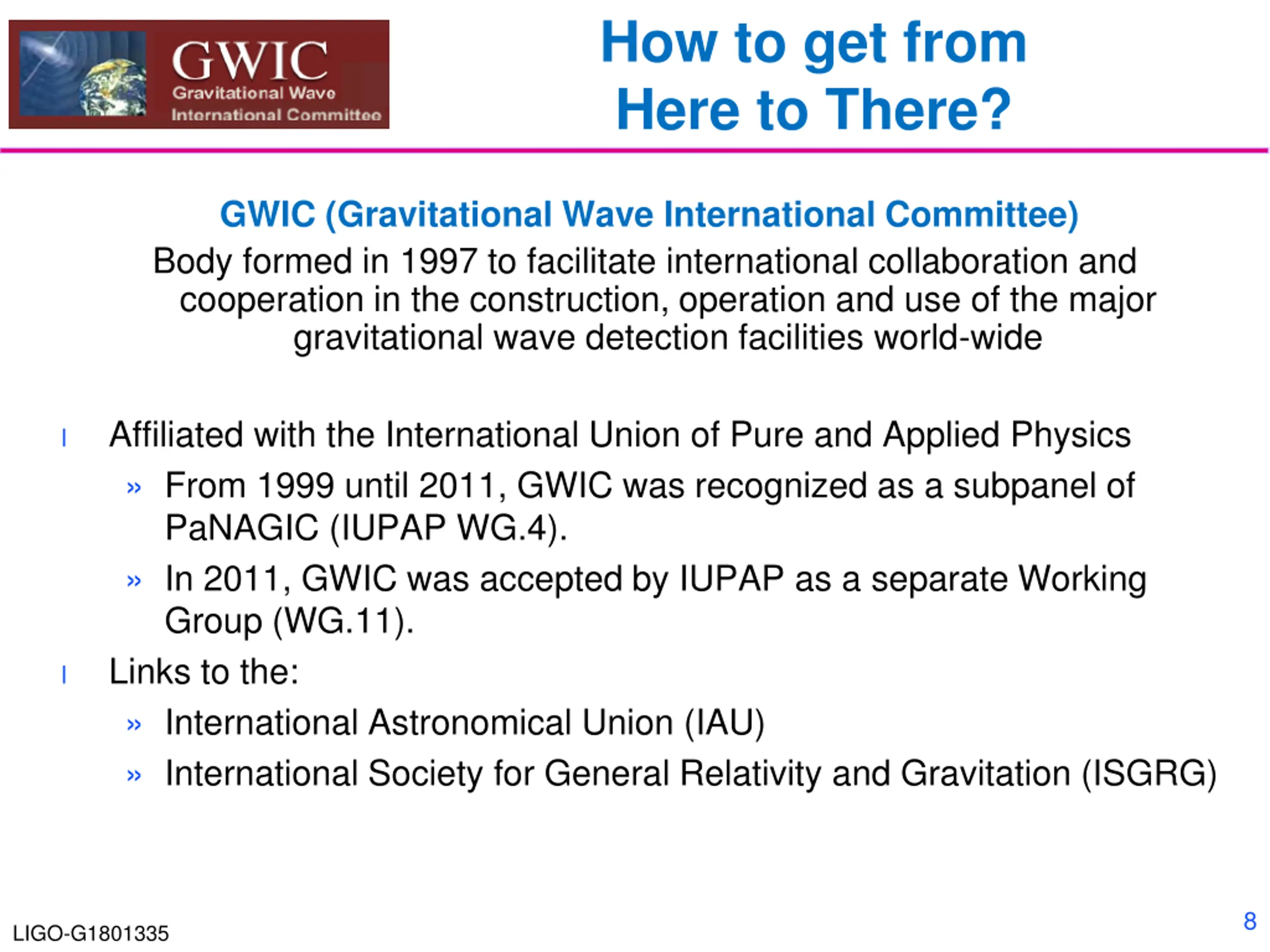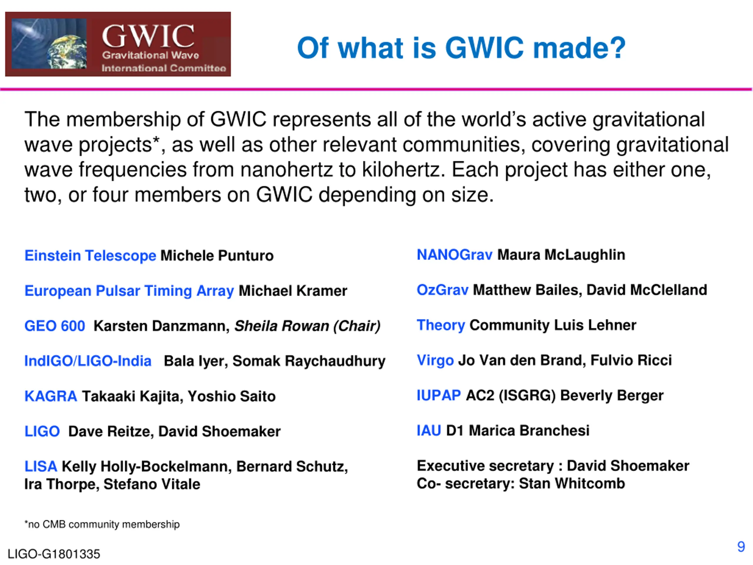 How to get from Here to There? GWIC (Gravitational Wave International Committee) Body formed in 1997 to facilitate international collaboration and cooperation in the construction, operation and use of the major gravitational wave detection facilities world-wide Affiliated with the International Union of Pure and Applied Physics From 1999 until 2011, GWIC was recognized as a subpanel of PaNAGIC (IUPAP WG.4). In 2011, GWIC was accepted by IUPAP as a separate Working Group (WG.11). Links to the: International Astronomical Union (IAU) International Society for General Relativity and Gravitation (ISGRG) l l 8 LIGO-G1801335