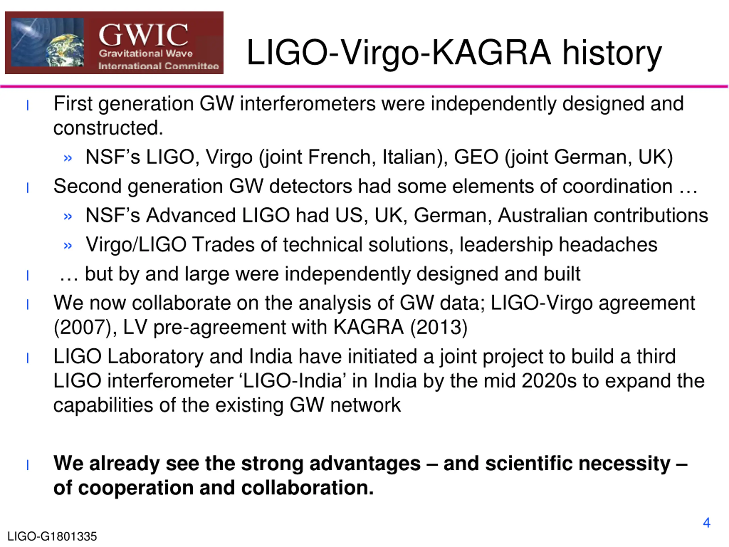 LIGO-Virgo-KAGRA history First generation GW interferometers were independently designed and constructed. NSF s LIGO, Virgo (joint French, Italian), GEO (joint German, UK) Second generation GW detectors had some elements of coordination NSF s Advanced LIGO had US, UK, German, Australian contributions Virgo/LIGO Trades of technical solutions, leadership headaches but by and large were independently designed and built We now collaborate on the analysis of GW data; LIGO-Virgo agreement (2007), LV pre-agreement with KAGRA (2013) LIGO Laboratory and India have initiated a joint project to build a third LIGO interferometer LIGO-India in India by the mid 2020s to expand the capabilities of the existing GW network l l l l l We already see the strong advantages and scientific necessity of cooperation and collaboration. l 4 LIGO-G1801335