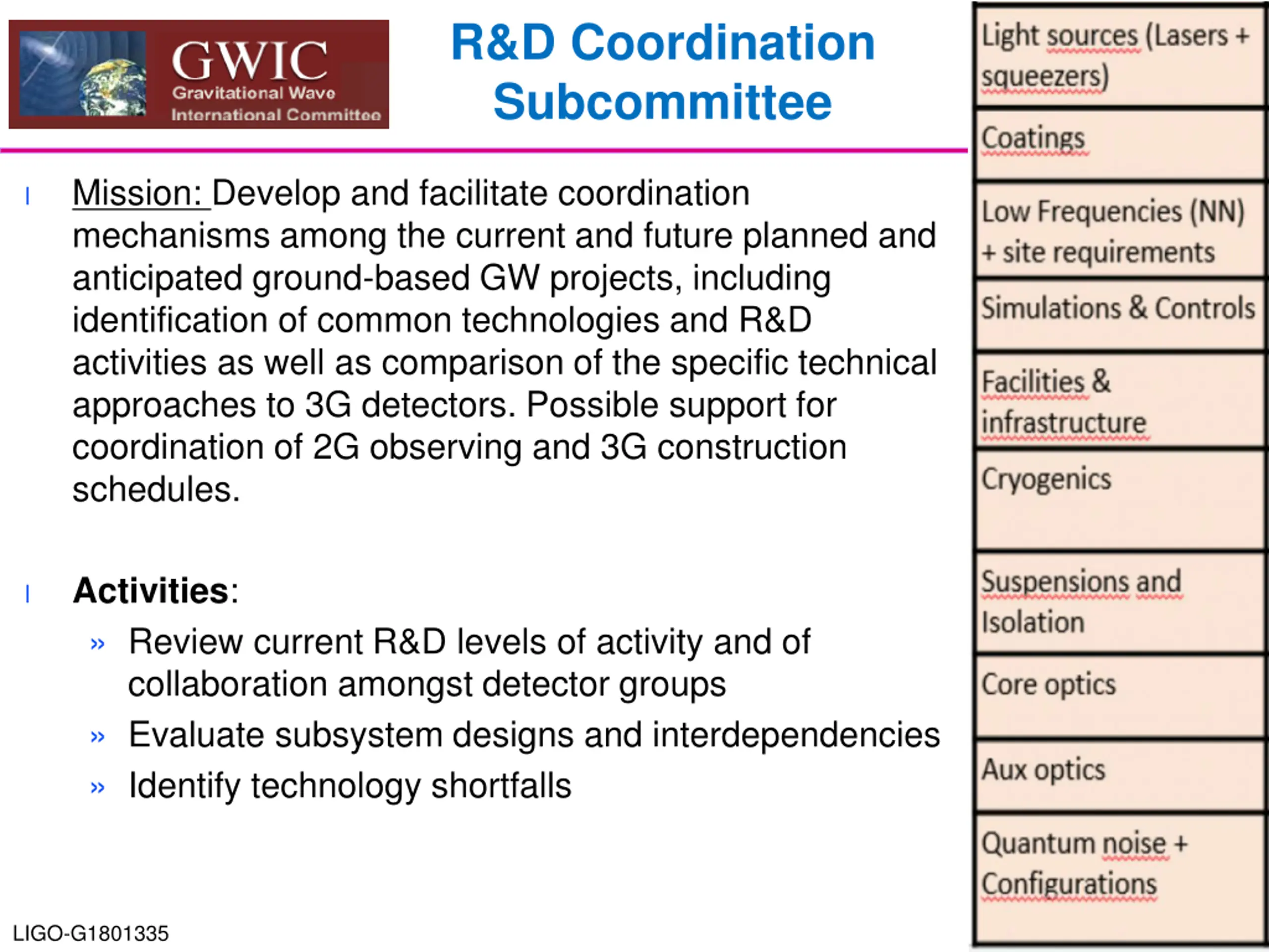 R&D Coordination Subcommittee Mission: Develop and facilitate coordination mechanisms among the current and future planned and anticipated ground-based GW projects, including identification of common technologies and R&D activities as well as comparison of the specific technical approaches to 3G detectors. Possible support for coordination of 2G observing and 3G construction schedules. l Activities: Review current R&D levels of activity and of collaboration amongst detector groups Evaluate subsystem designs and interdependencies Identify technology shortfalls l LIGO-G1801335