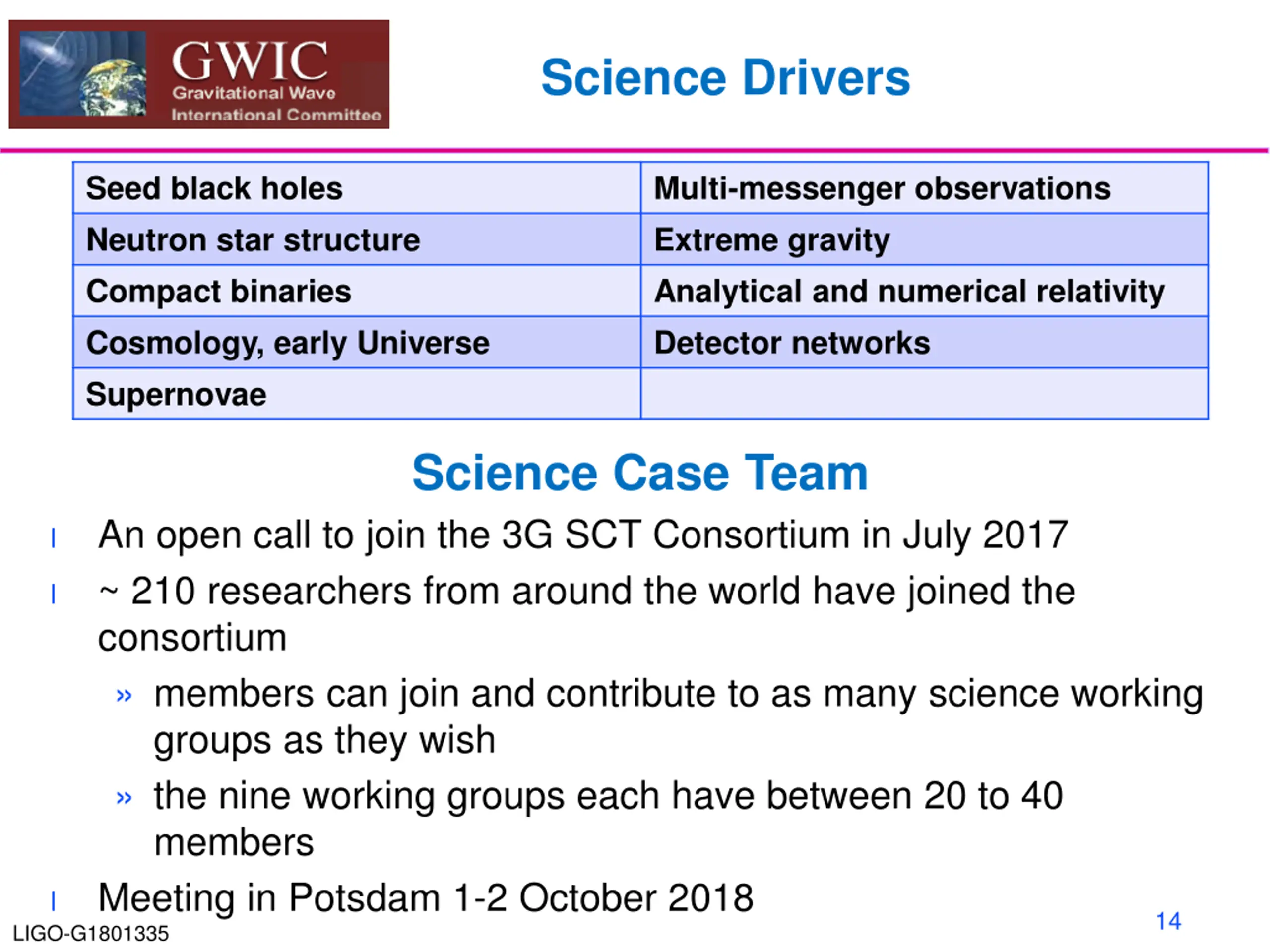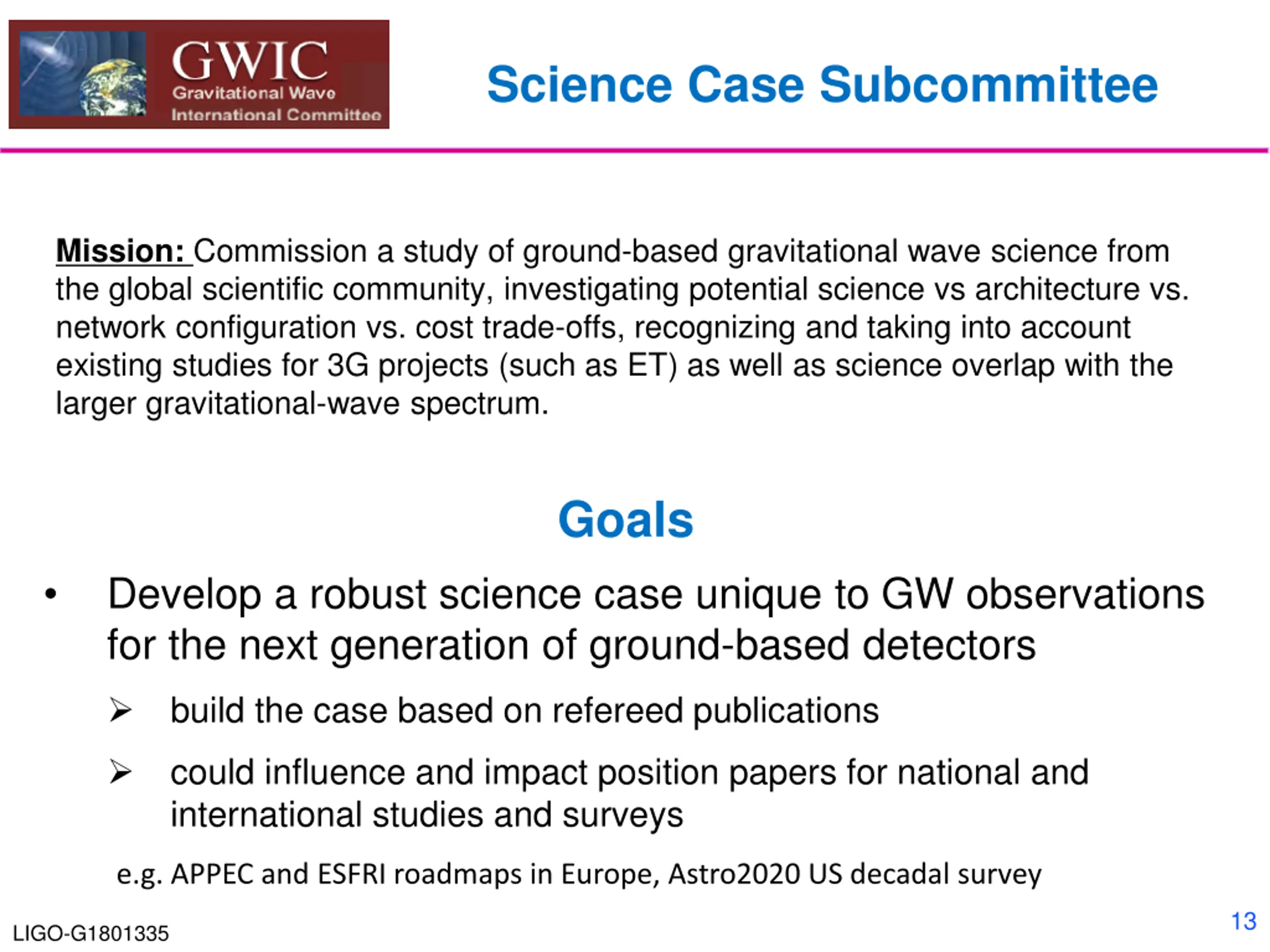 Science Case Subcommittee Mission: Commission a study of ground-based gravitational wave science from the global scientific community, investigating potential science vs architecture vs. network configuration vs. cost trade-offs, recognizing and taking into account existing studies for 3G projects (such as ET) as well as science overlap with the larger gravitational-wave spectrum. Goals Develop a robust science case unique to GW observations for the next generation of ground-based detectors build the case based on refereed publications could influence and impact position papers for national and international studies and surveys e.g. APPEC and ESFRI roadmaps in Europe, Astro2020 US decadal survey 13 LIGO-G1801335