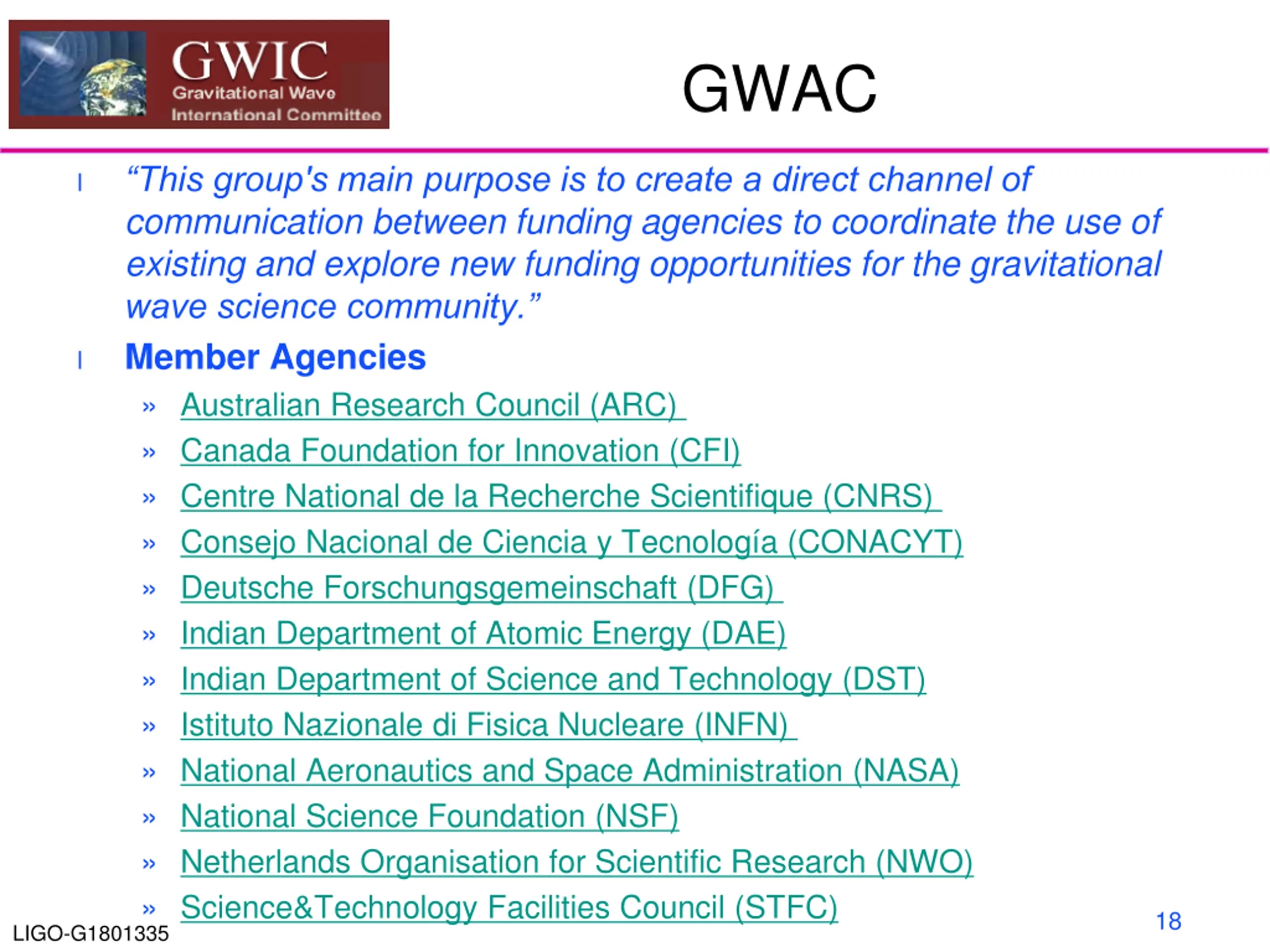GWAC This group's main purpose is to create a direct channel of communication between funding agencies to coordinate the use of existing and explore new funding opportunities for the gravitational wave science community. Member Agencies Australian Research Council (ARC) Canada Foundation for Innovation (CFI) Centre National de la Recherche Scientifique (CNRS) Consejo Nacional de Ciencia y Tecnolog a (CONACYT) Deutsche Forschungsgemeinschaft (DFG) Indian Department of Atomic Energy (DAE) Indian Department of Science and Technology (DST) Istituto Nazionale di Fisica Nucleare (INFN) National Aeronautics and Space Administration (NASA) National Science Foundation (NSF) Netherlands Organisation for Scientific Research (NWO) Science&Technology Facilities Council (STFC) l l 18 LIGO-G1801335