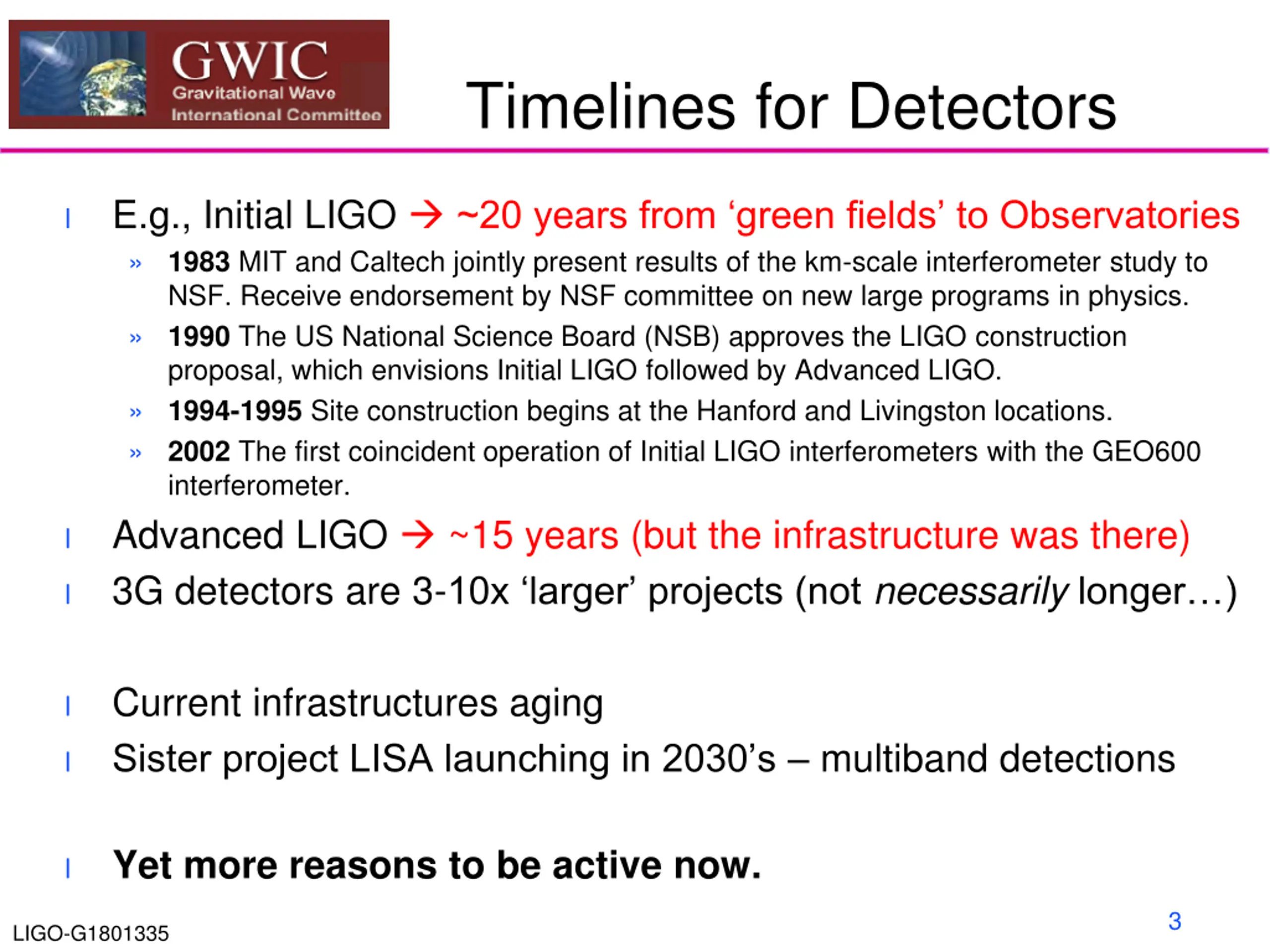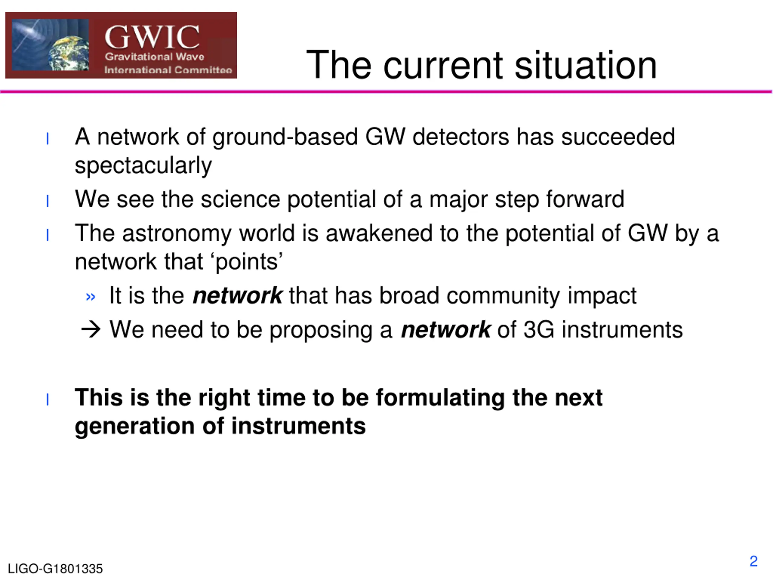 The current situation A network of ground-based GW detectors has succeeded spectacularly We see the science potential of a major step forward The astronomy world is awakened to the potential of GW by a network that points It is the network that has broad community impact We need to be proposing a network of 3G instruments l l l This is the right time to be formulating the next generation of instruments l 2 LIGO-G1801335