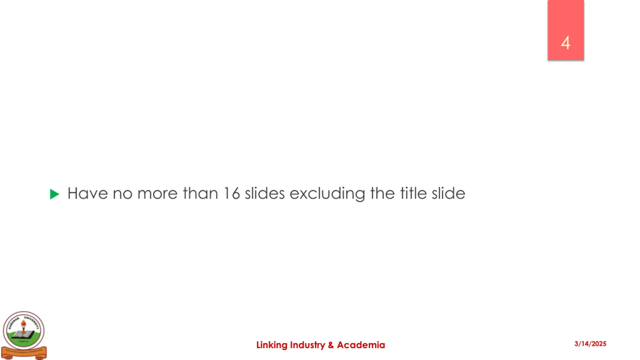 4 Have no more than 16 slides excluding the title slide Linking Industry & Academia 3/14/2025