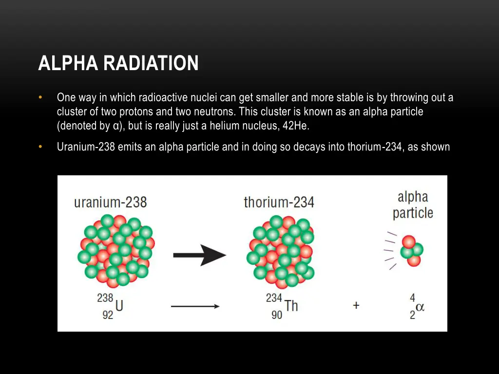 ALPHA RADIATION One way in which radioactive nuclei can get smaller and more stable is by throwing out a cluster of two protons and two neutrons. This cluster is known as an alpha particle (denoted by ), but is really just a helium nucleus, 42He. Uranium-238 emits an alpha particle and in doing so decays into thorium-234, as shown