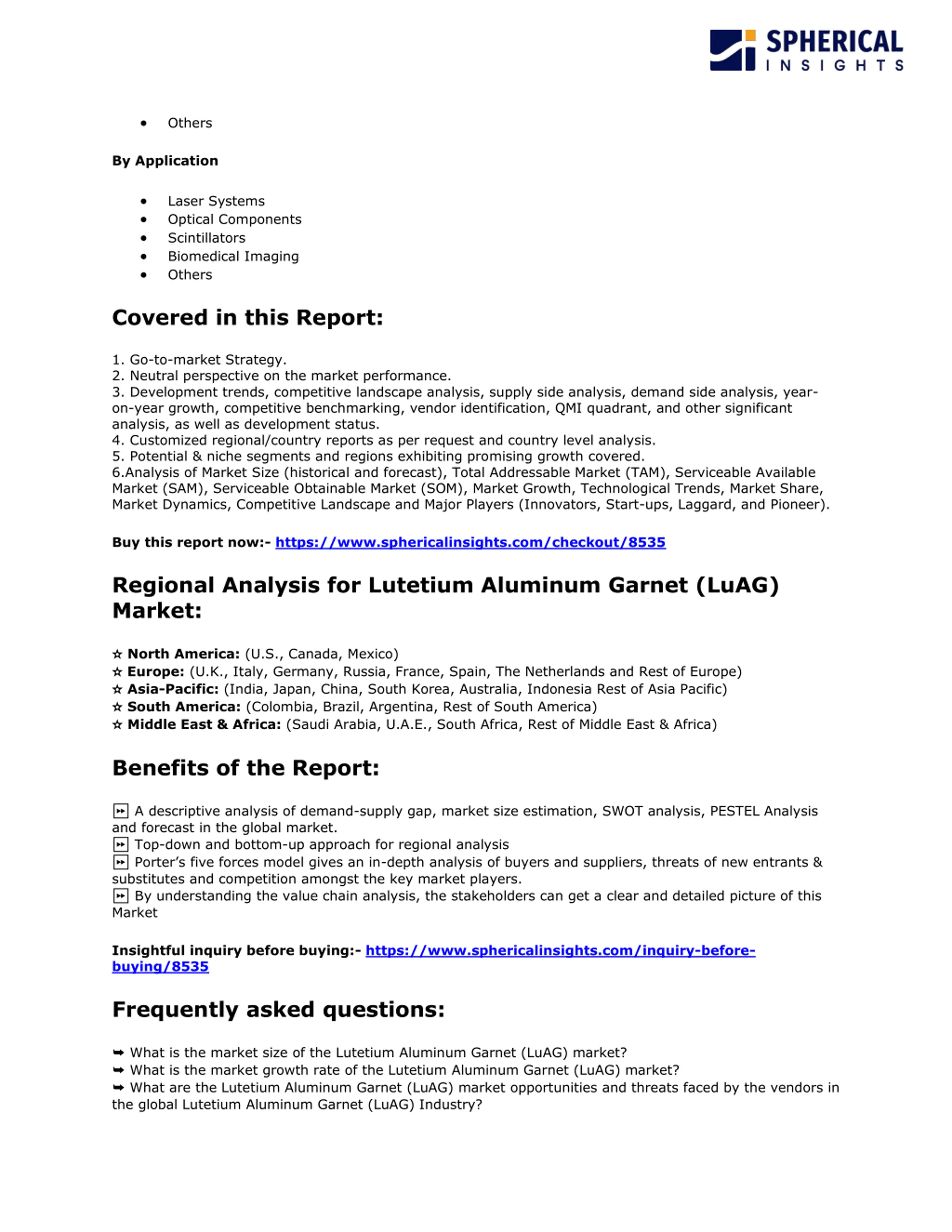 Others By Application Laser Systems Optical Components Scintillators Biomedical Imaging Others Covered in this Report: 1. Go-to-market Strategy. 2. Neutral perspective on the market performance. 3. Development trends, competitive landscape analysis, supply side analysis, demand side analysis, year- on-year growth, competitive benchmarking, vendor identification, QMI quadrant, and other significant analysis, as well as development status. 4. Customized regional/country reports as per request and country level analysis. 5. Potential & niche segments and regions exhibiting promising growth covered. 6.Analysis of Market Size (historical and forecast), Total Addressable Market (TAM), Serviceable Available Market (SAM), Serviceable Obtainable Market (SOM), Market Growth, Technological Trends, Market Share, Market Dynamics, Competitive Landscape and Major Players (Innovators, Start-ups, Laggard, and Pioneer). Buy this report now:- https://www.sphericalinsights.com/checkout/8535 Regional Analysis for Lutetium Aluminum Garnet (LuAG) Market: North America: (U.S., Canada, Mexico) Europe: (U.K., Italy, Germany, Russia, France, Spain, The Netherlands and Rest of Europe) Asia-Pacific: (India, Japan, China, South Korea, Australia, Indonesia Rest of Asia Pacific) South America: (Colombia, Brazil, Argentina, Rest of South America) Middle East & Africa: (Saudi Arabia, U.A.E., South Africa, Rest of Middle East & Africa) Benefits of the Report: A descriptive analysis of demand-supply gap, market size estimation, SWOT analysis, PESTEL Analysis and forecast in the global market. Top-down and bottom-up approach for regional analysis Porter s five forces model gives an in-depth analysis of buyers and suppliers, threats of new entrants & substitutes and competition amongst the key market players. By understanding the value chain analysis, the stakeholders can get a clear and detailed picture of this Market Insightful inquiry before buying:- https://www.sphericalinsights.com/inquiry-before- buying/8535 Frequently asked questions: What is the market size of the Lutetium Aluminum Garnet (LuAG) market? What is the market growth rate of the Lutetium Aluminum Garnet (LuAG) market? What are the Lutetium Aluminum Garnet (LuAG) market opportunities and threats faced by the vendors in the global Lutetium Aluminum Garnet (LuAG) Industry?