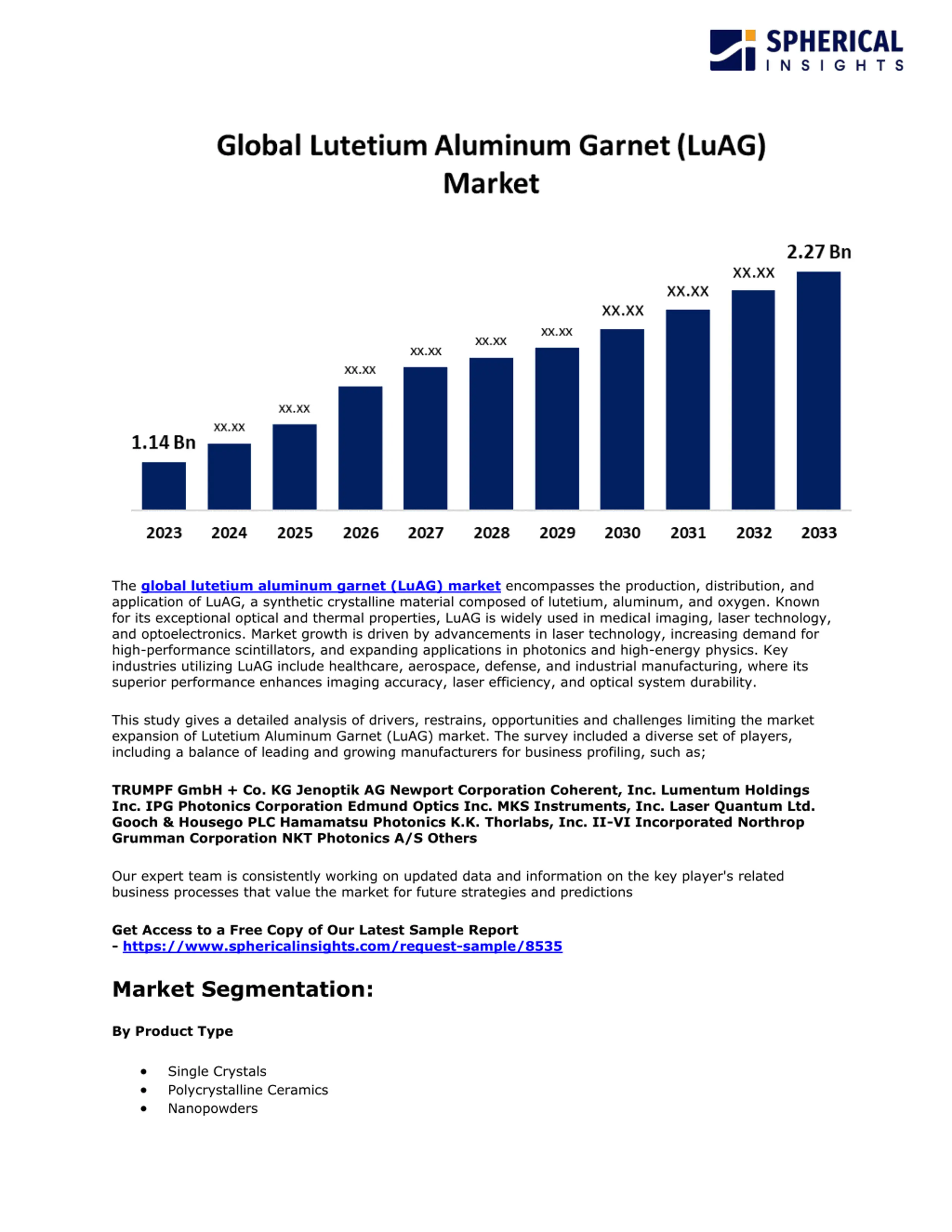 The global lutetium aluminum garnet (LuAG) market encompasses the production, distribution, and application of LuAG, a synthetic crystalline material composed of lutetium, aluminum, and oxygen. Known for its exceptional optical and thermal properties, LuAG is widely used in medical imaging, laser technology, and optoelectronics. Market growth is driven by advancements in laser technology, increasing demand for high-performance scintillators, and expanding applications in photonics and high-energy physics. Key industries utilizing LuAG include healthcare, aerospace, defense, and industrial manufacturing, where its superior performance enhances imaging accuracy, laser efficiency, and optical system durability. This study gives a detailed analysis of drivers, restrains, opportunities and challenges limiting the market expansion of Lutetium Aluminum Garnet (LuAG) market. The survey included a diverse set of players, including a balance of leading and growing manufacturers for business profiling, such as; TRUMPF GmbH + Co. KG Jenoptik AG Newport Corporation Coherent, Inc. Lumentum Holdings Inc. IPG Photonics Corporation Edmund Optics Inc. MKS Instruments, Inc. Laser Quantum Ltd. Gooch & Housego PLC Hamamatsu Photonics K.K. Thorlabs, Inc. II-VI Incorporated Northrop Grumman Corporation NKT Photonics A/S Others Our expert team is consistently working on updated data and information on the key player's related business processes that value the market for future strategies and predictions Get Access to a Free Copy of Our Latest Sample Report - https://www.sphericalinsights.com/request-sample/8535 Market Segmentation: By Product Type Single Crystals Polycrystalline Ceramics Nanopowders