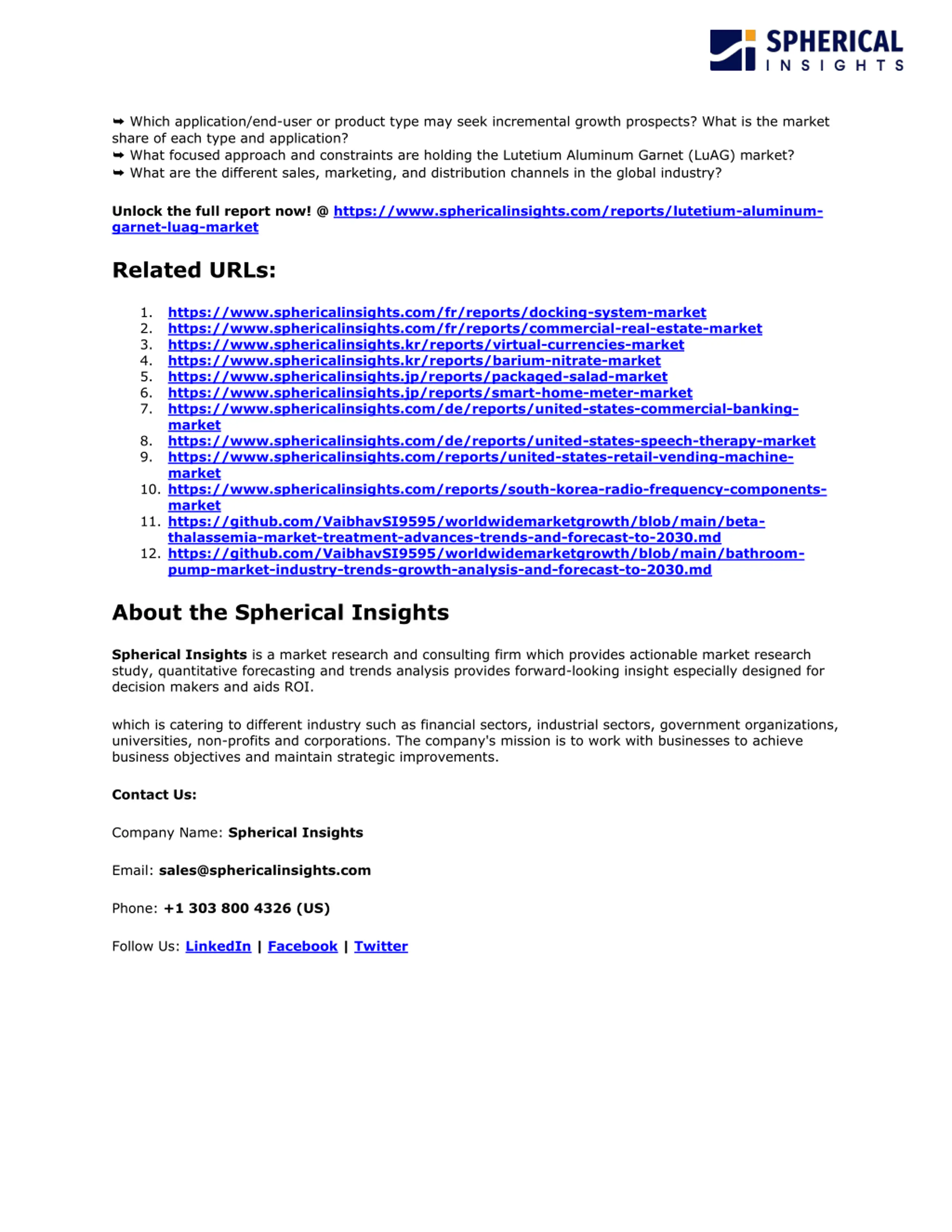Which application/end-user or product type may seek incremental growth prospects? What is the market share of each type and application? What focused approach and constraints are holding the Lutetium Aluminum Garnet (LuAG) market? What are the different sales, marketing, and distribution channels in the global industry? Unlock the full report now! @ https://www.sphericalinsights.com/reports/lutetium-aluminum- garnet-luag-market Related URLs: 1.https://www.sphericalinsights.com/fr/reports/docking-system-market 2.https://www.sphericalinsights.com/fr/reports/commercial-real-estate-market 3.https://www.sphericalinsights.kr/reports/virtual-currencies-market 4.https://www.sphericalinsights.kr/reports/barium-nitrate-market 5.https://www.sphericalinsights.jp/reports/packaged-salad-market 6.https://www.sphericalinsights.jp/reports/smart-home-meter-market 7.https://www.sphericalinsights.com/de/reports/united-states-commercial-banking- market 8.https://www.sphericalinsights.com/de/reports/united-states-speech-therapy-market 9.https://www.sphericalinsights.com/reports/united-states-retail-vending-machine- market 10.https://www.sphericalinsights.com/reports/south-korea-radio-frequency-components- market 11.https://github.com/VaibhavSI9595/worldwidemarketgrowth/blob/main/beta- thalassemia-market-treatment-advances-trends-and-forecast-to-2030.md 12.https://github.com/VaibhavSI9595/worldwidemarketgrowth/blob/main/bathroom- pump-market-industry-trends-growth-analysis-and-forecast-to-2030.md About the Spherical Insights Spherical Insights is a market research and consulting firm which provides actionable market research study, quantitative forecasting and trends analysis provides forward-looking insight especially designed for decision makers and aids ROI. which is catering to different industry such as financial sectors, industrial sectors, government organizations, universities, non-profits and corporations. The company's mission is to work with businesses to achieve business objectives and maintain strategic improvements. Contact Us: Company Name: Spherical Insights Email: sales@sphericalinsights.com Phone: +1 303 800 4326 (US) Follow Us: LinkedIn | Facebook | Twitter