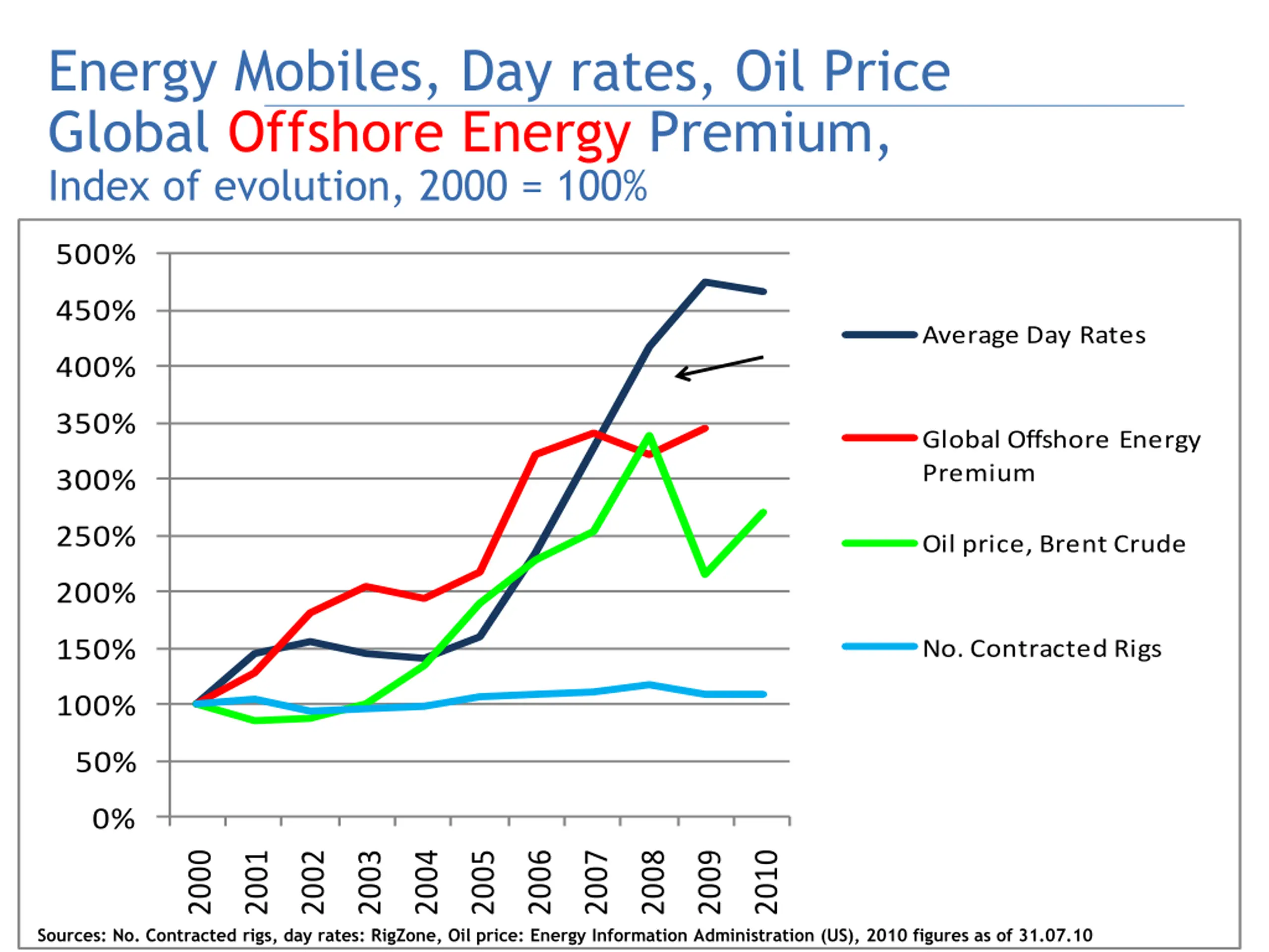 Energy Mobiles, Day rates, Oil Price Global Offshore Energy Premium, Index of evolution, 2000 = 100% 500% 450% Average Day Rates 400% 350% Global Offshore Energy Premium 300% 250% Oil price, Brent Crude 200% 150% No. Contracted Rigs 100% 50% 0% 2000 2001 2003 2004 2005 2006 2007 2008 2010 2002 2009 12 TO 15 SEPTEMBER 29 Sources: No. Contracted rigs, day rates: RigZone, Oil price: Energy Information Administration (US), 2010 figures as of 31.07.10