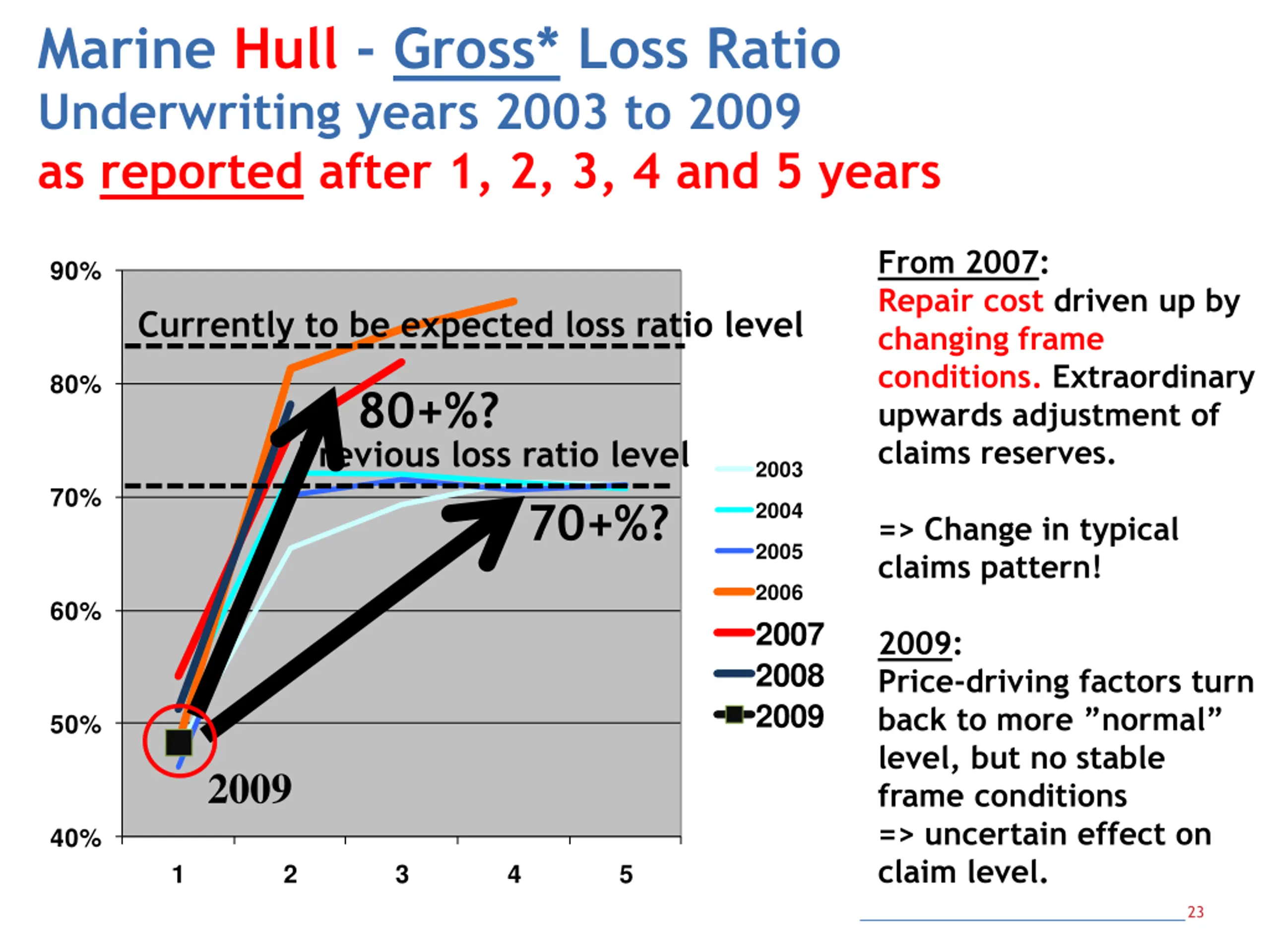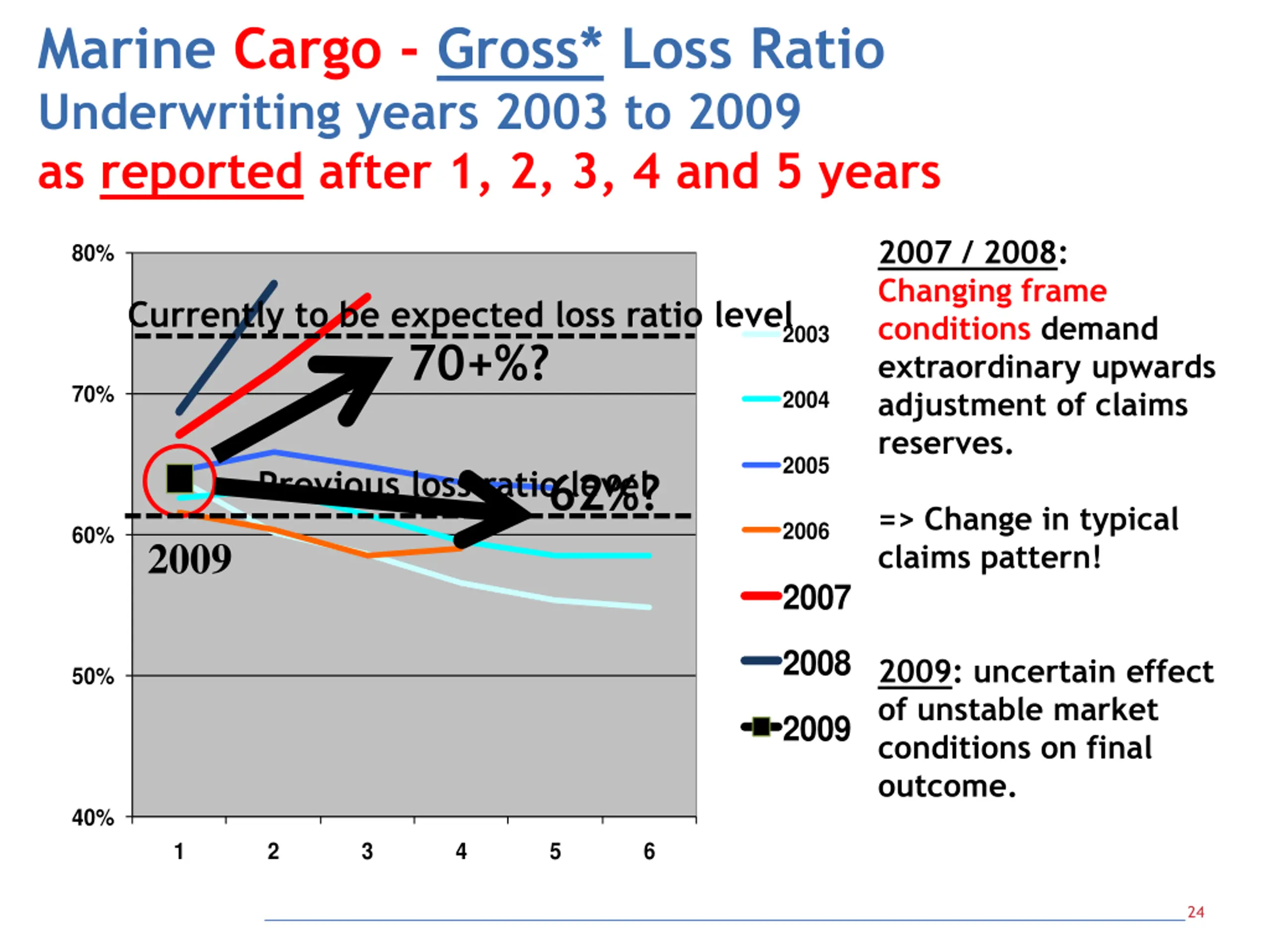 Marine Hull - Gross* Loss Ratio Underwriting years 2003 to 2009 as reported after 1, 2, 3, 4 and 5 years From 2007: Repair cost driven up by changing frame conditions. Extraordinary upwards adjustment of claims reserves. 90% Currently to be expected loss ratio level 80% 80+%? Previous loss ratio level 2003 70% 70+%? 2004 => Change in typical claims pattern! 2005 2006 2007 2008 2009 60% 2009: Price-driving factors turn back to more normal level, but no stable frame conditions => uncertain effect on claim level. 50% 2009 40% 1 2 3 4 5 12 TO 15 SEPTEMBER 23