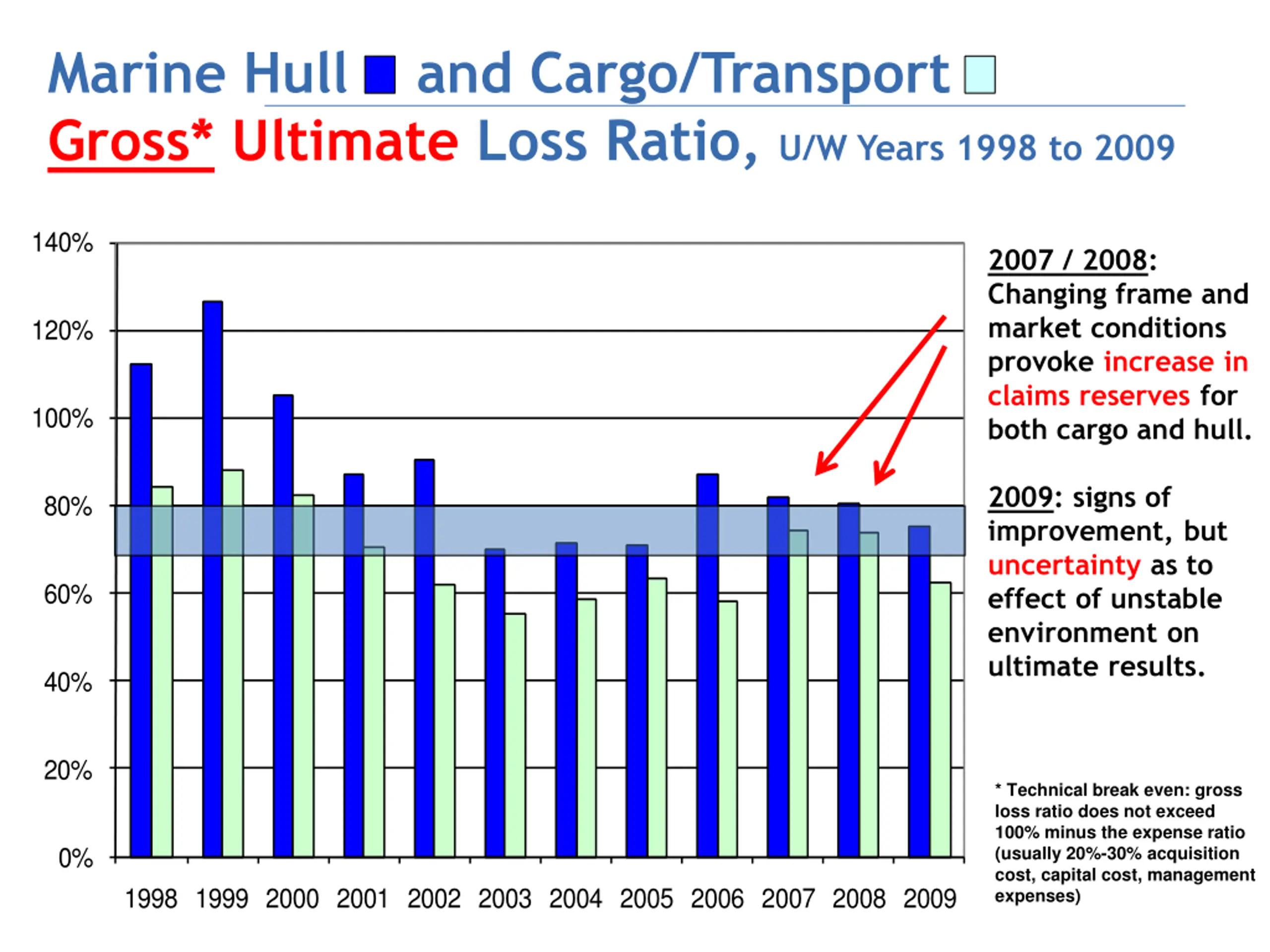 Marine Hull and Cargo/Transport Gross* Ultimate Loss Ratio, U/W Years 1998 to 2009 140% 2007 / 2008: Changing frame and market conditions provoke increase in claims reserves for both cargo and hull. 120% 100% 2009: signs of improvement, but 80% Marine Hull Cargo/Transport uncertainty as to effect of unstable environment on ultimate results. 60% 40% 20% * Technical break even: gross loss ratio does not exceed 100% minus the expense ratio (usually 20%-30% acquisition cost, capital cost, management expenses) 0% 1998 1999 2000 2001 2002 2003 2004 2005 2006 2007 2008 2009 12 TO 15 SEPTEMBER 21