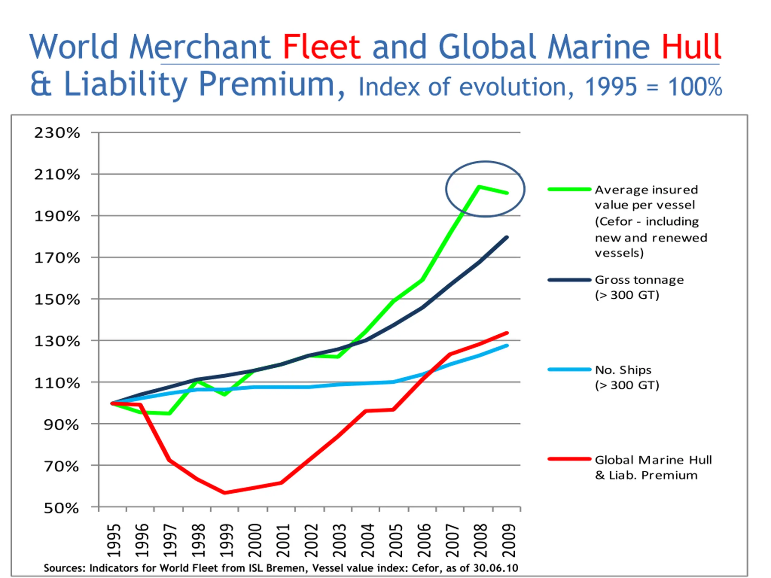 World Merchant Fleet and Global Marine Hull & Liability Premium, Index of evolution, 1995 = 100% 230% 210% Average insured value per vessel (Cefor - including new and renewed vessels) 190% 170% Gross tonnage (> 300 GT) 150% 130% No. Ships (> 300 GT) 110% 90% Global Marine Hull & Liab. Premium 70% 50% 1995 1996 1997 1998 1999 2000 2001 2005 2006 2007 2008 2009 2002 2003 2004 12 TO 15 SEPTEMBER 18 Sources: Indicators for World Fleet from ISL Bremen, Vessel value index: Cefor, as of 30.06.10