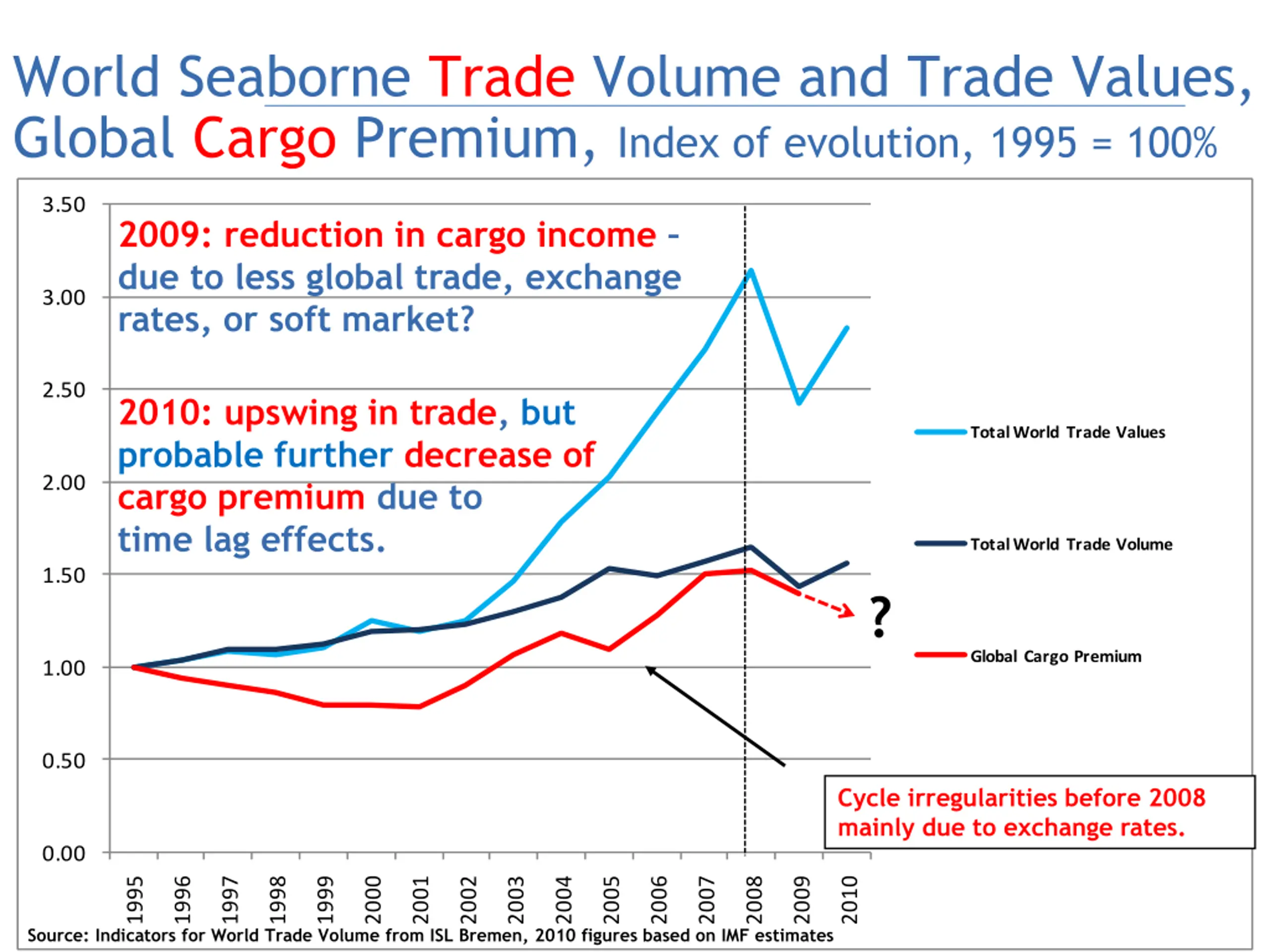 World Seaborne Trade Volume and Trade Values, Global Cargo Premium, Index of evolution, 1995 = 100% 3.50 2009: reduction in cargo income due to less global trade, exchange rates, or soft market? 3.00 2.50 2010: upswing in trade, but probable further decrease of cargo premium due to time lag effects. Total World Trade Values 2.00 Total World Trade Volume 1.50 ? Global Cargo Premium 1.00 0.50 Cycle irregularities before 2008 mainly due to exchange rates. 0.00 1995 1998 1999 2001 2002 2004 2005 2008 2009 1996 1997 2000 2003 2006 2007 2010 12 TO 15 SEPTEMBER 16 Source: Indicators for World Trade Volume from ISL Bremen, 2010 figures based on IMF estimates