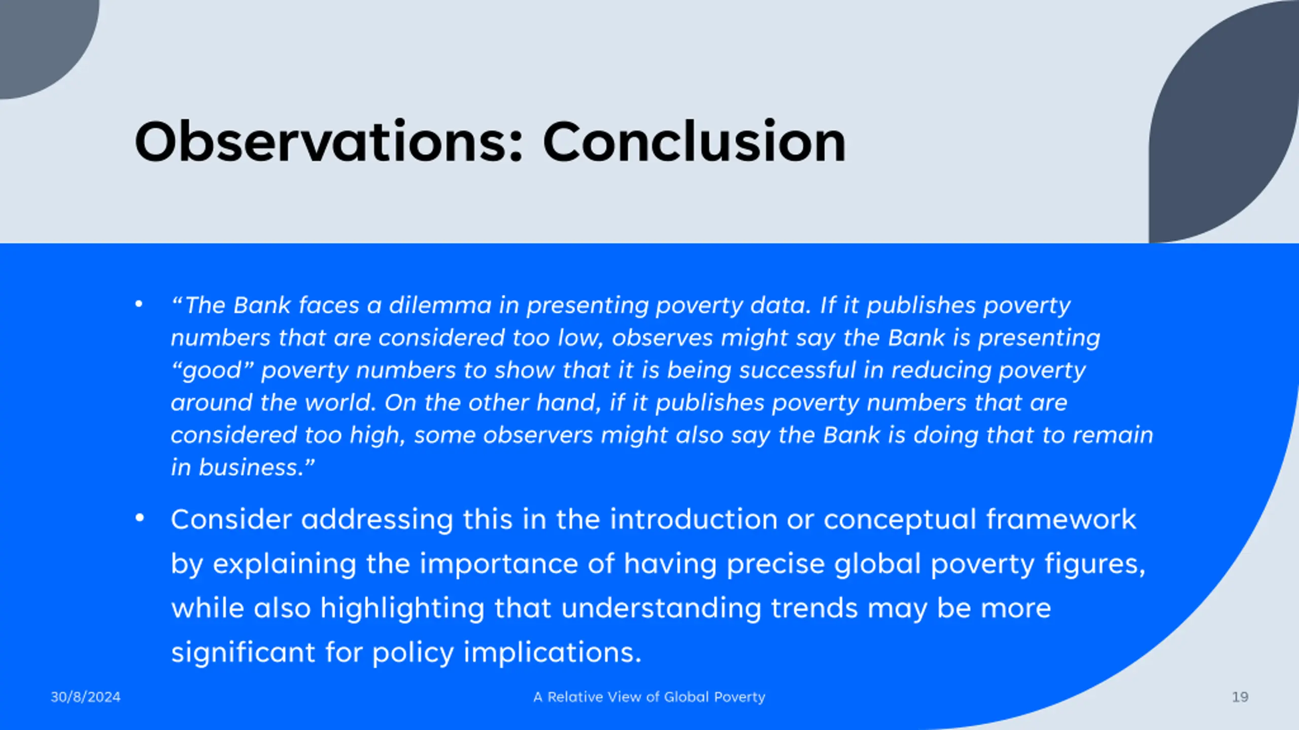 Observations: Conclusion The Bank faces a dilemma in presenting poverty data. If it publishes poverty numbers that are considered too low, observes might say the Bank is presenting good poverty numbers to show that it is being successful in reducing poverty around the world. On the other hand, if it publishes poverty numbers that are considered too high, some observers might also say the Bank is doing that to remain in business. Consider addressing this in the introduction or conceptual framework by explaining the importance of having precise global poverty figures, while also highlighting that understanding trends may be more significant for policy implications. 30/8/2024 A Relative View of Global Poverty 19