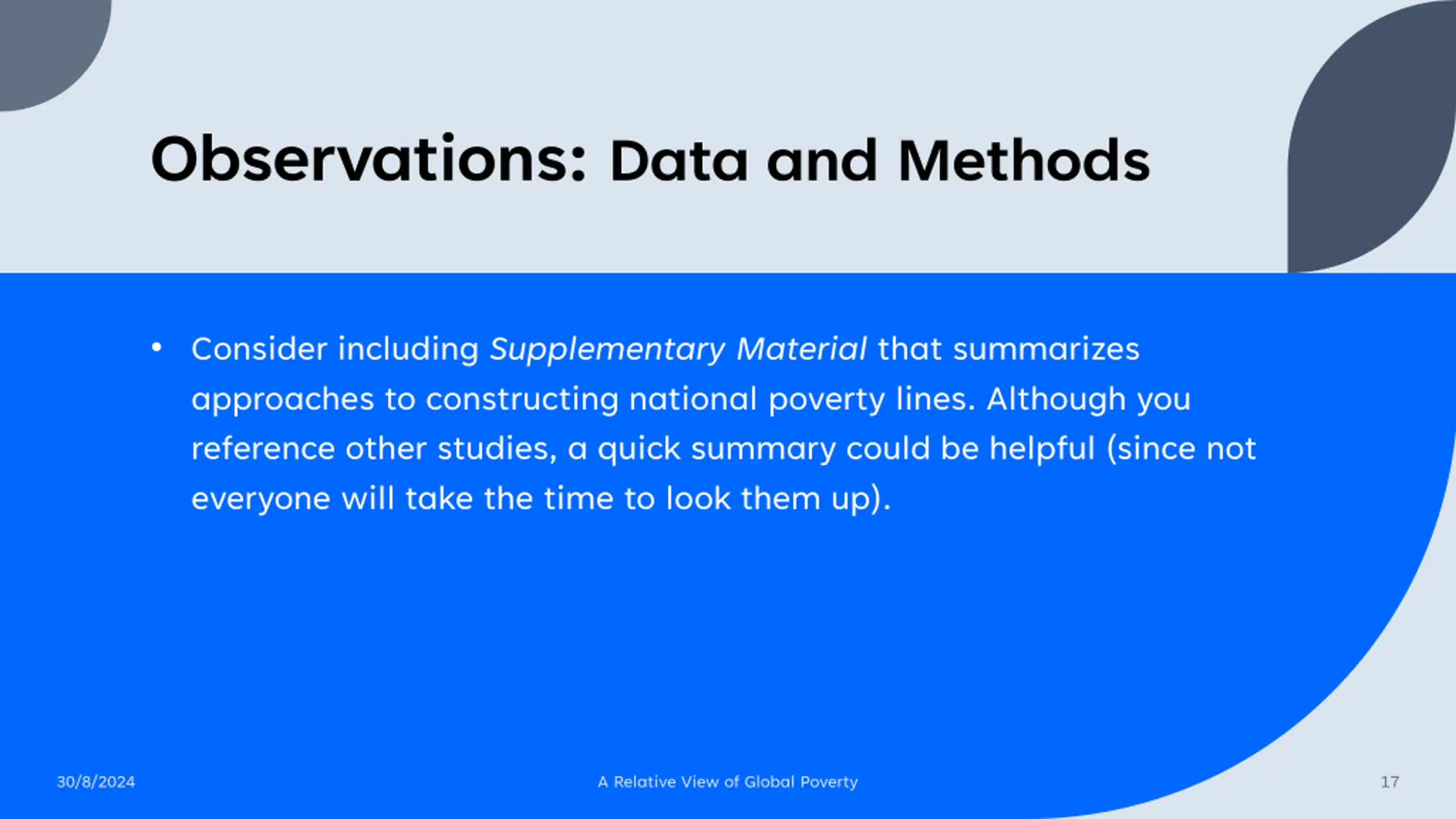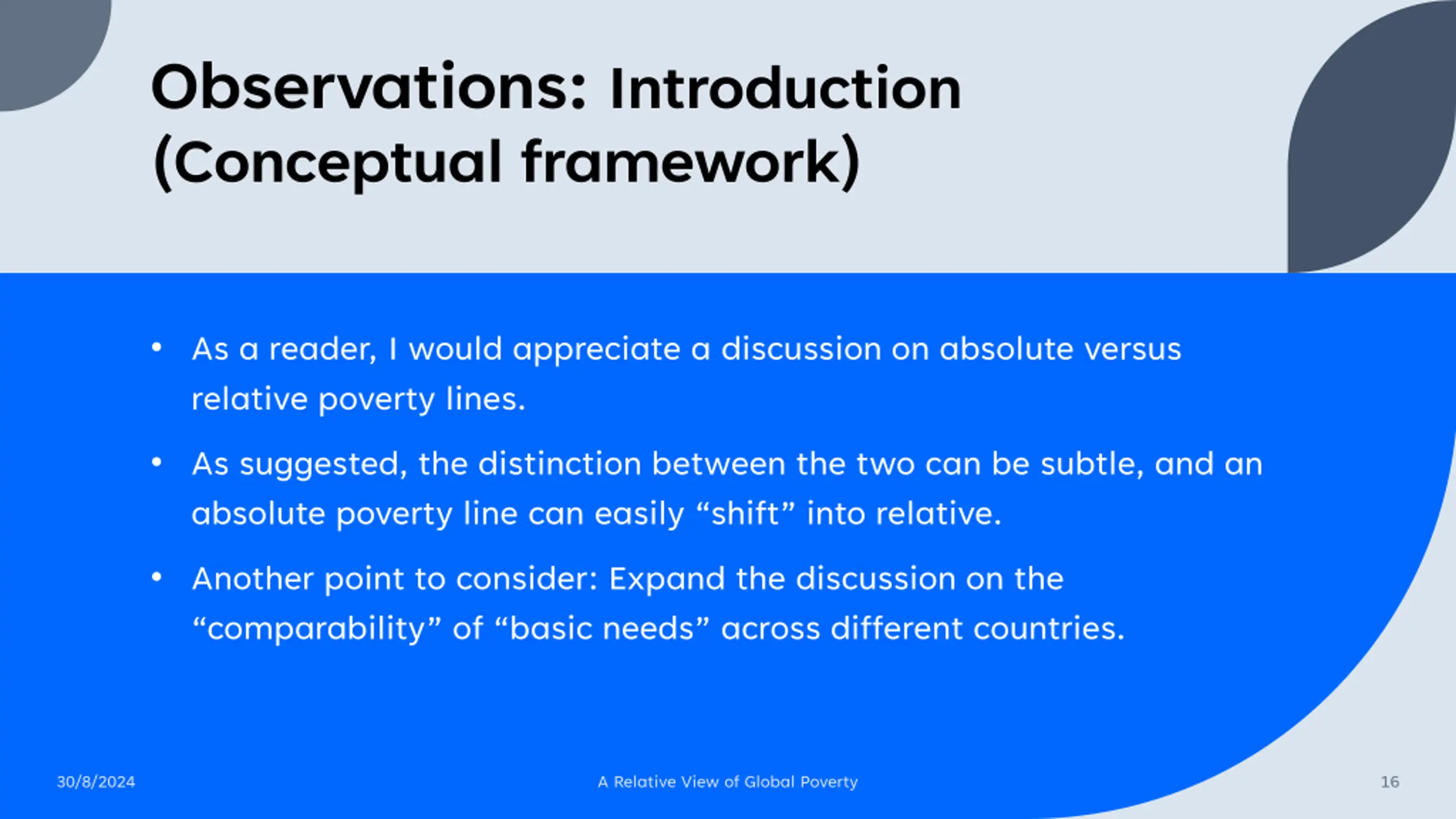 Observations: Introduction (Conceptual framework) As a reader, I would appreciate a discussion on absolute versus relative poverty lines. As suggested, the distinction between the two can be subtle, and an absolute poverty line can easily shift into relative. Another point to consider: Expand the discussion on the comparability of basic needs across different countries. 30/8/2024 A Relative View of Global Poverty 16