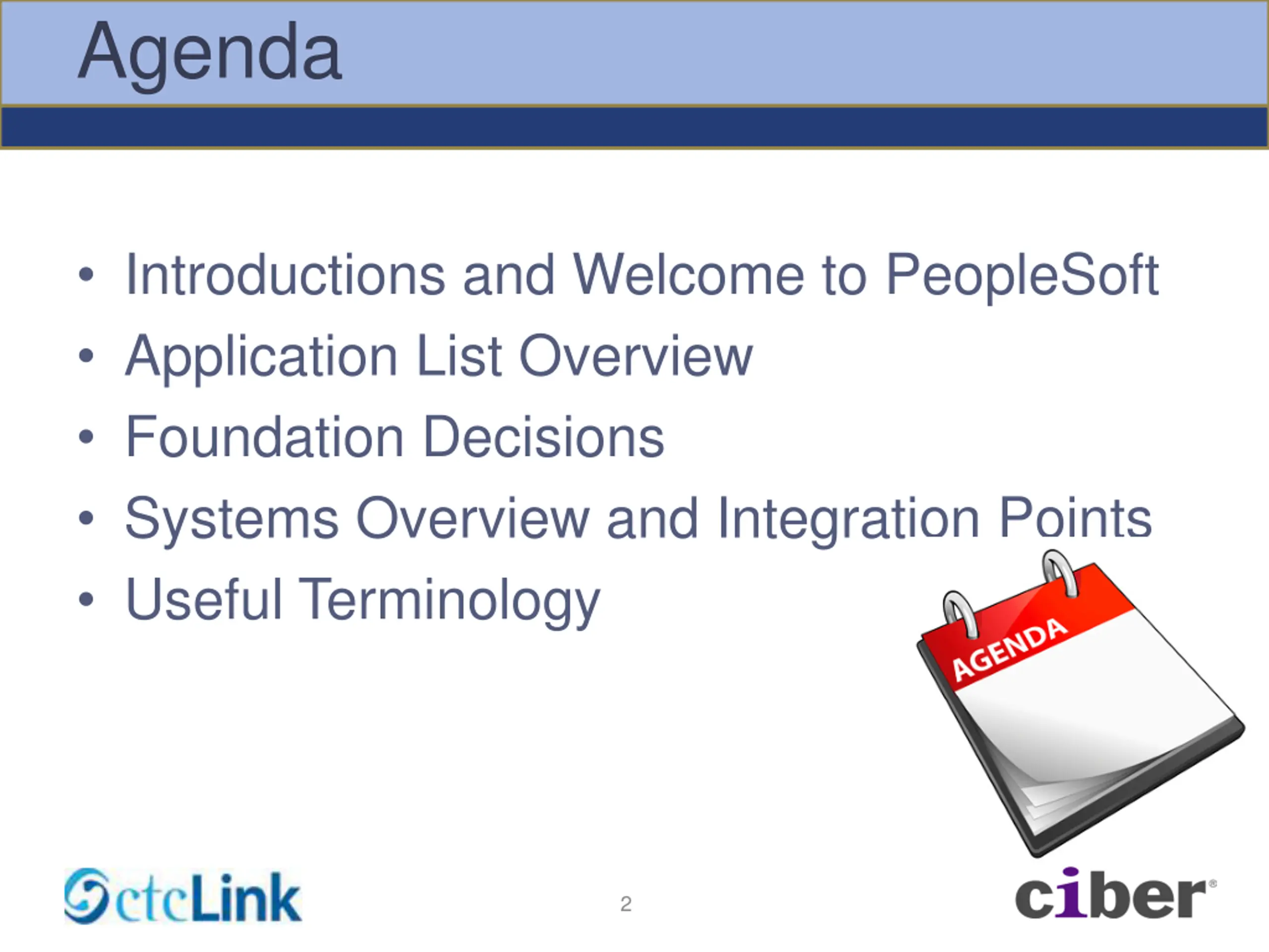 Agenda Introductions and Welcome to PeopleSoft Application List Overview Foundation Decisions Systems Overview and Integration Points Useful Terminology 2