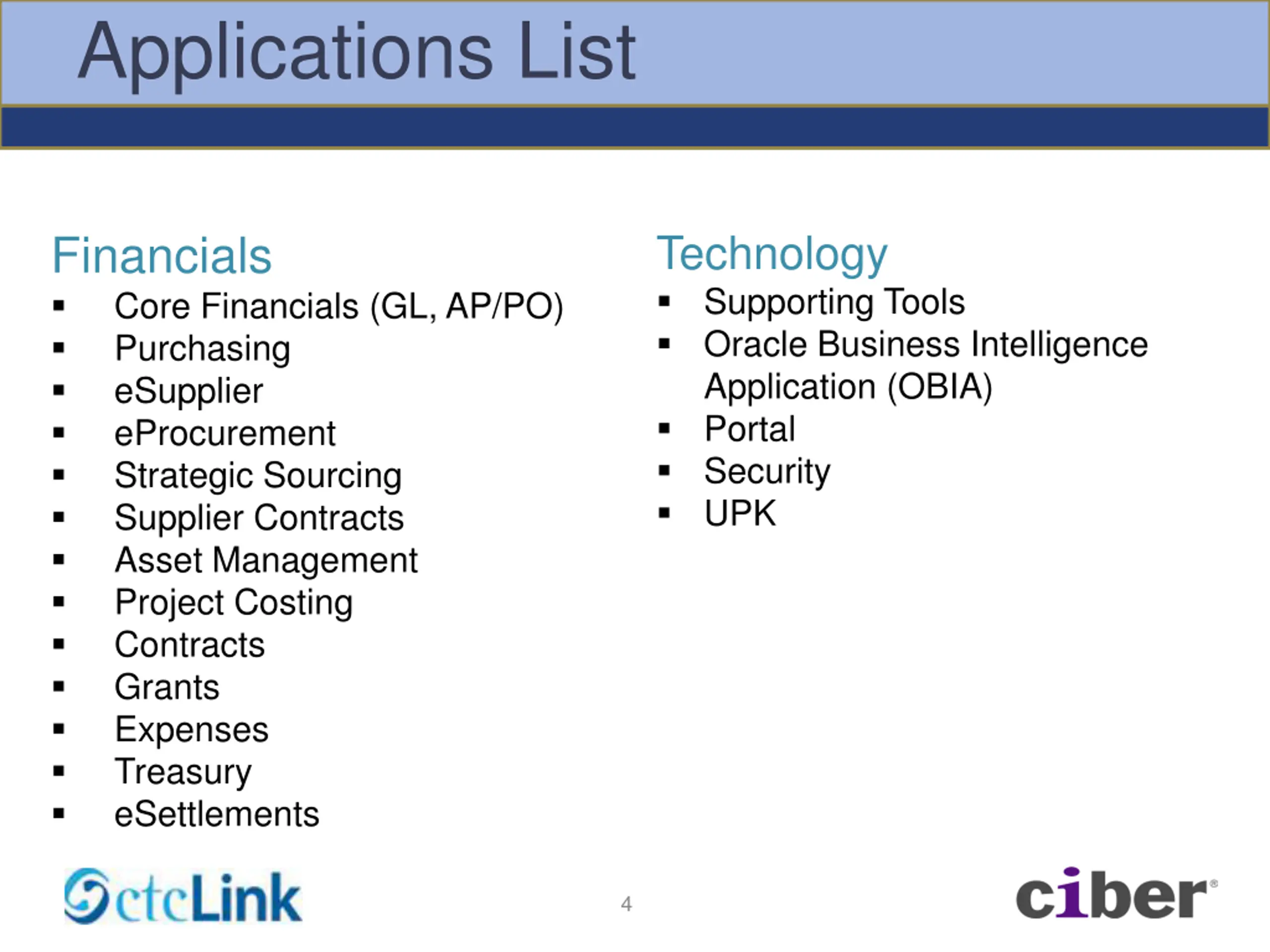 Applications List Technology Supporting Tools Oracle Business Intelligence Application (OBIA) Portal Security UPK Financials Core Financials (GL, AP/PO) Purchasing eSupplier eProcurement Strategic Sourcing Supplier Contracts Asset Management Project Costing Contracts Grants Expenses Treasury eSettlements 4