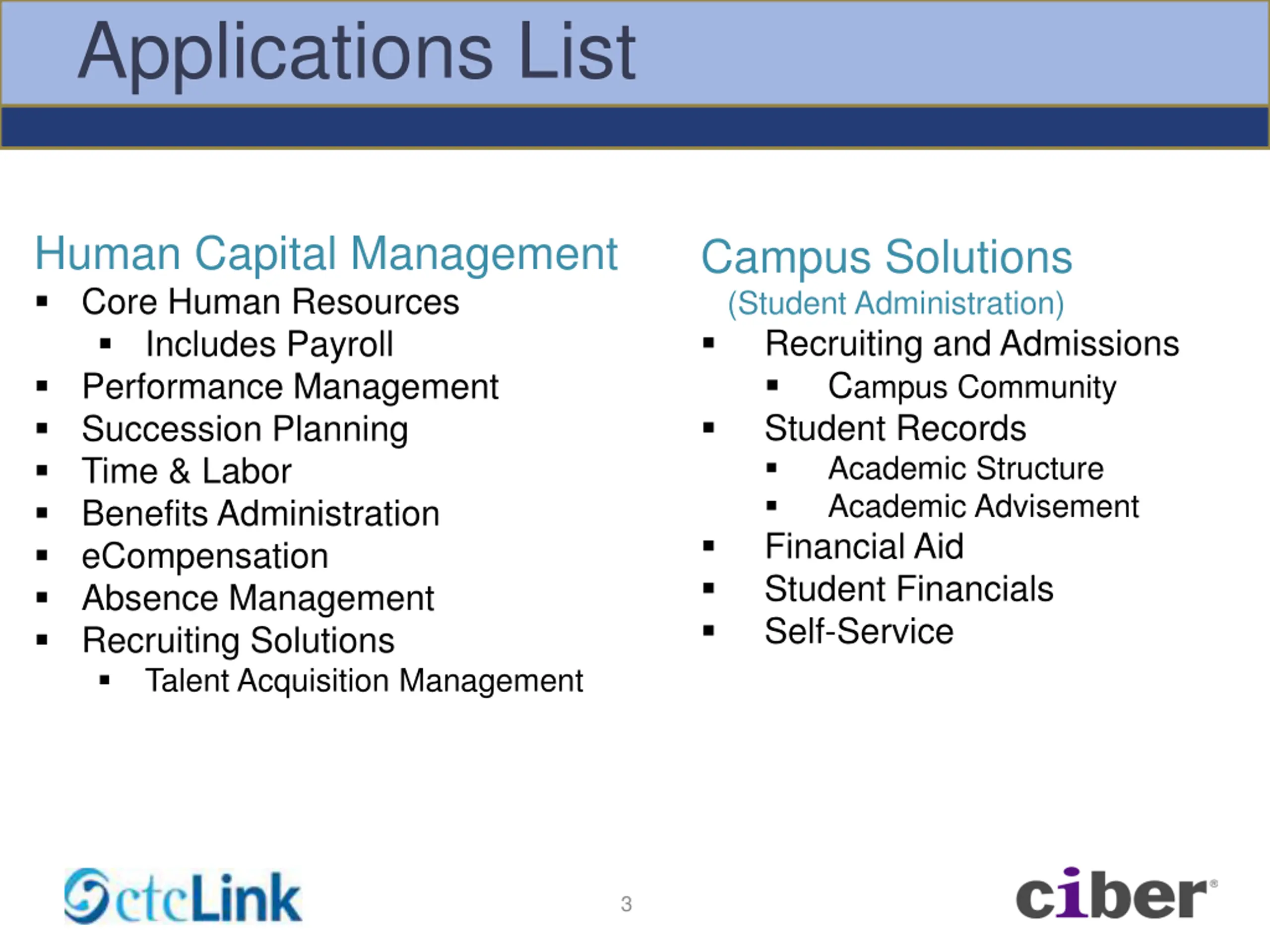 Applications List Human Capital Management Core Human Resources Includes Payroll Performance Management Succession Planning Time & Labor Benefits Administration eCompensation Absence Management Recruiting Solutions Talent Acquisition Management Campus Solutions (Student Administration) Recruiting and Admissions Campus Community Student Records Academic Structure Academic Advisement Financial Aid Student Financials Self-Service 3