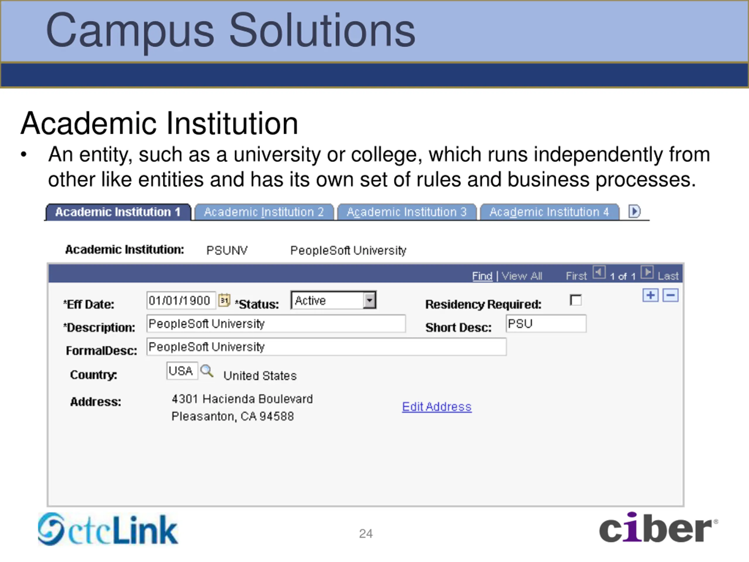 Campus Solutions Academic Institution An entity, such as a university or college, which runs independently from other like entities and has its own set of rules and business processes. 24
