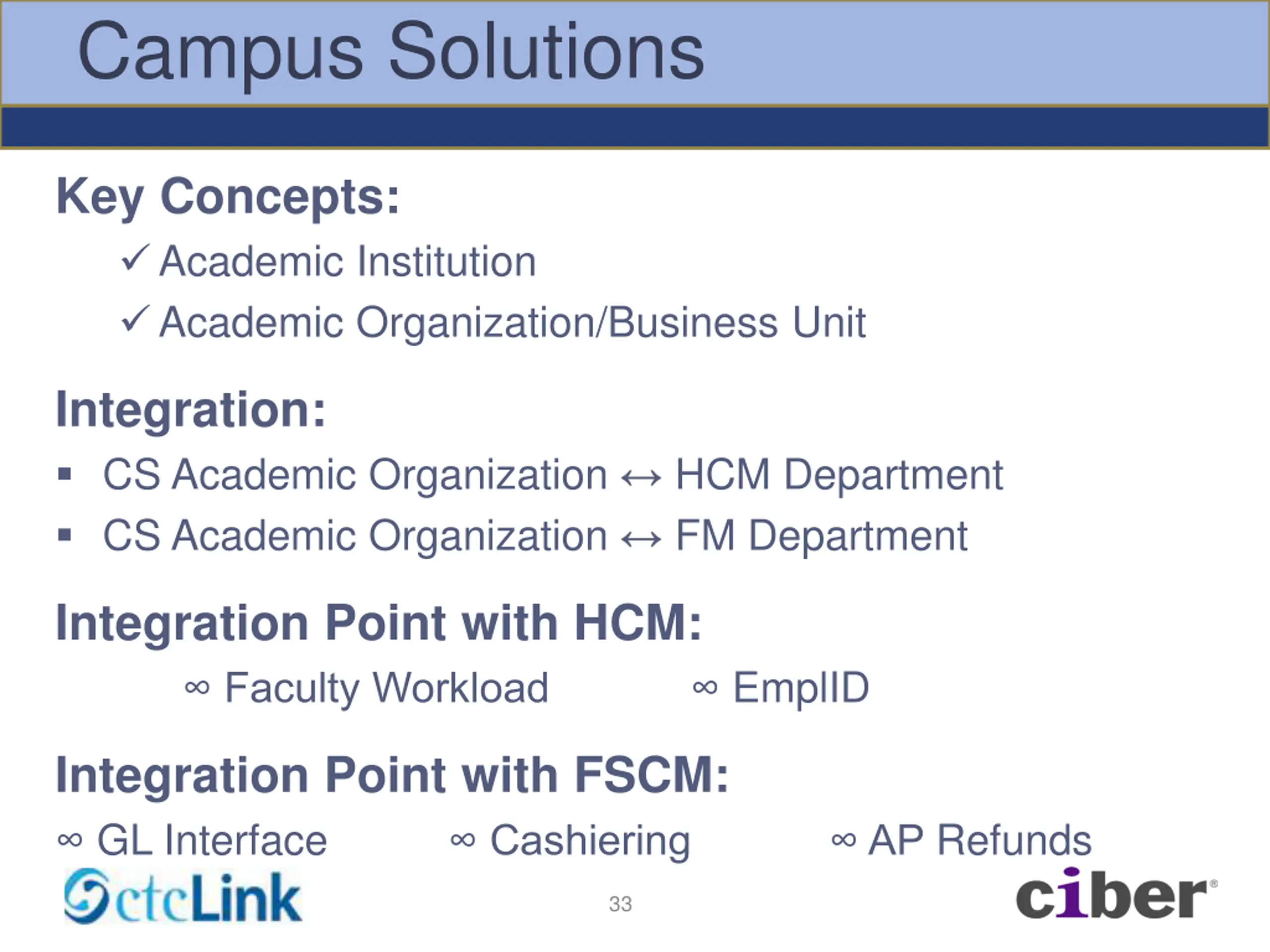 Campus Solutions Key Concepts: Academic Institution Academic Organization/Business Unit Integration: CS Academic Organization CS Academic Organization HCM Department FM Department Integration Point with HCM: Faculty Workload EmplID Integration Point with FSCM: GL Interface Cashiering AP Refunds 33