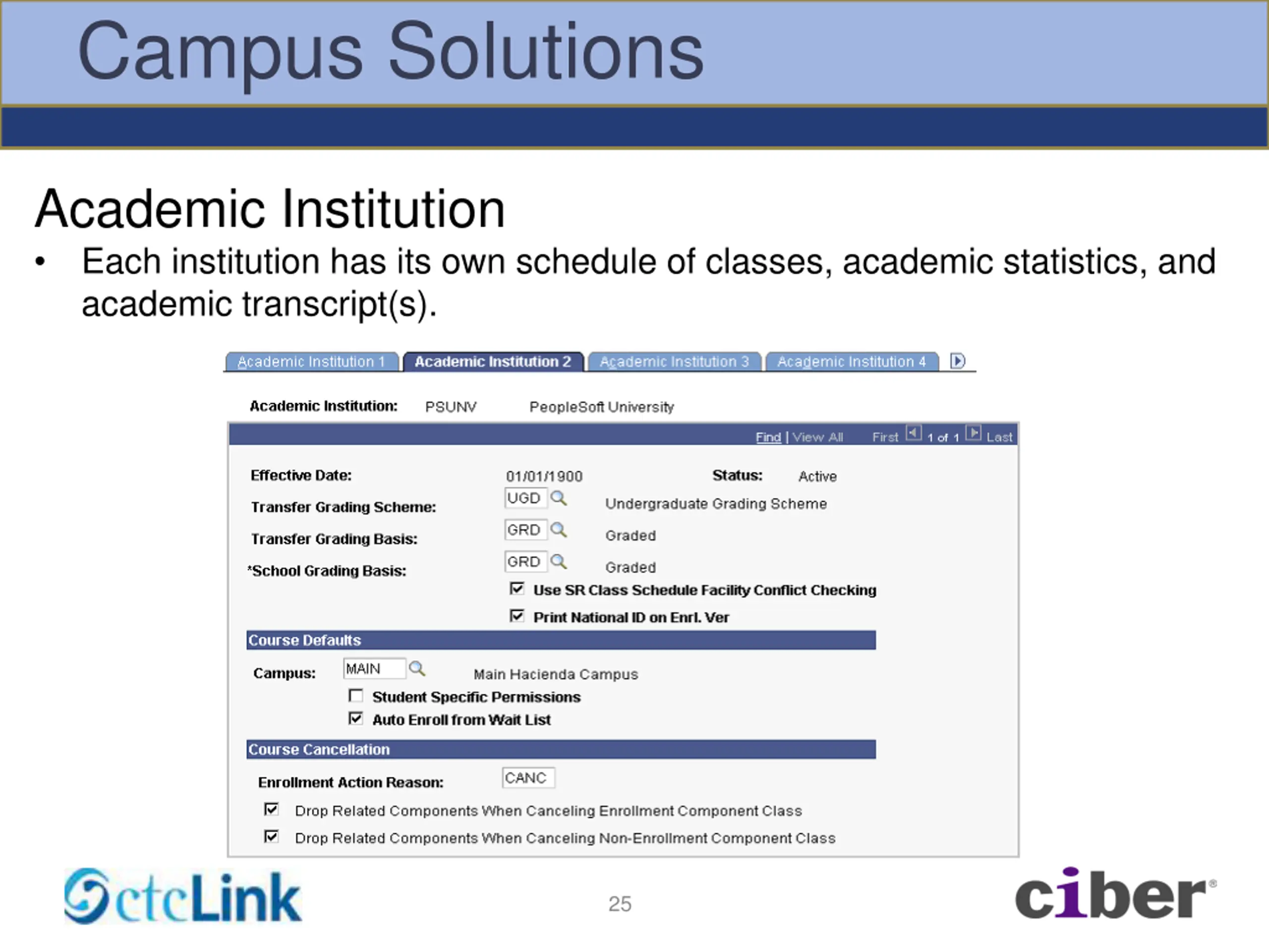 Campus Solutions Academic Institution Each institution has its own schedule of classes, academic statistics, and academic transcript(s). 25